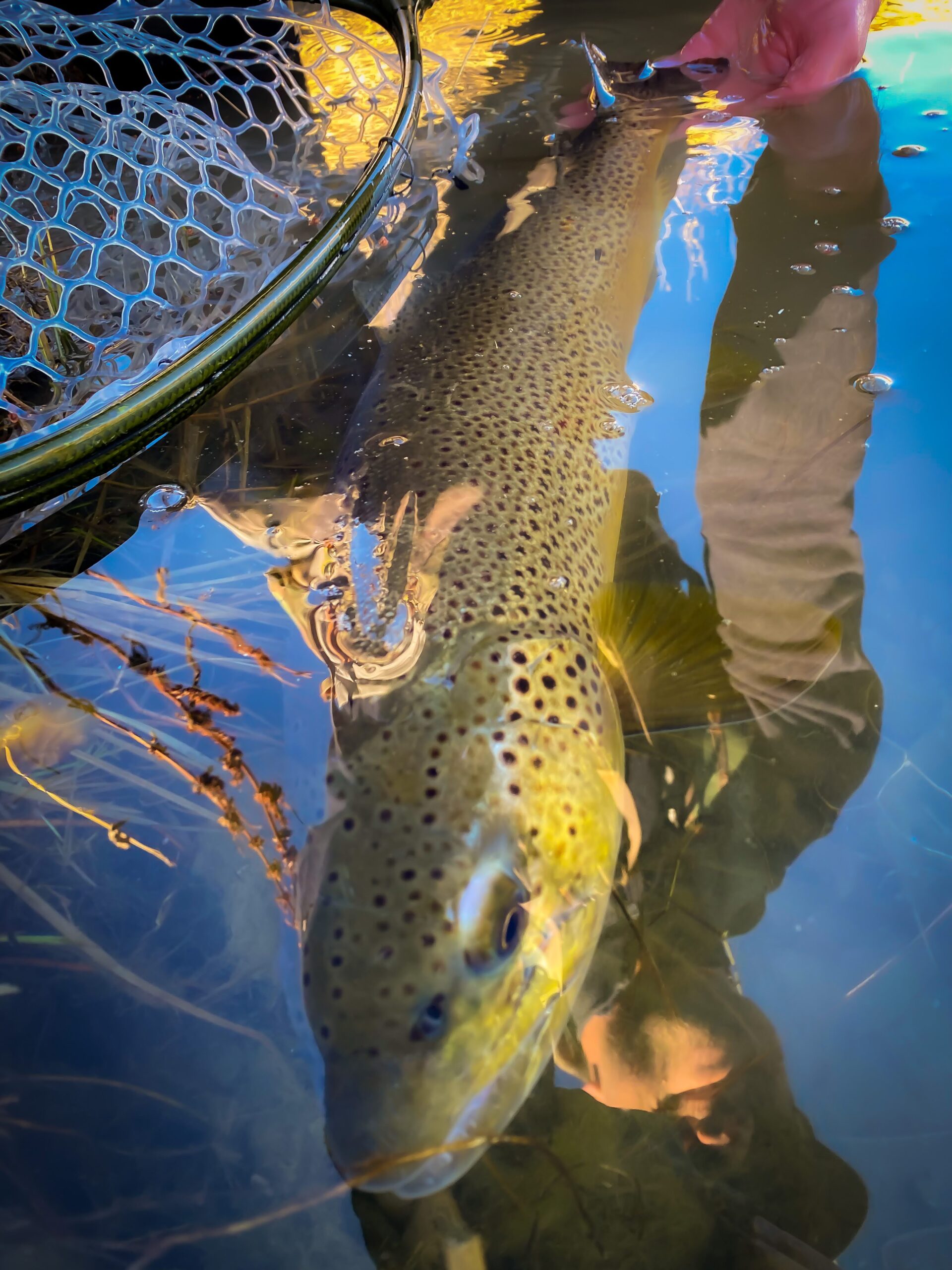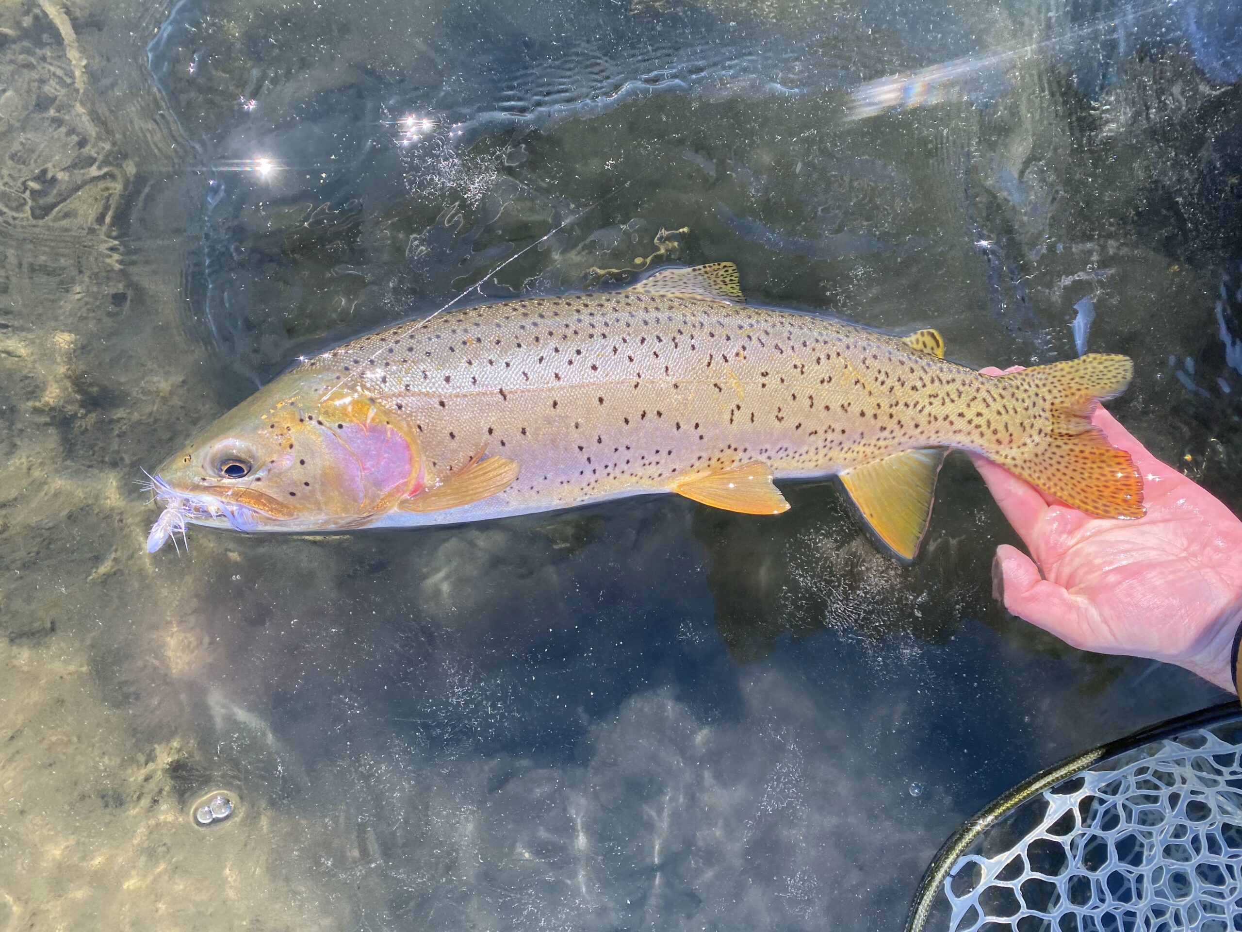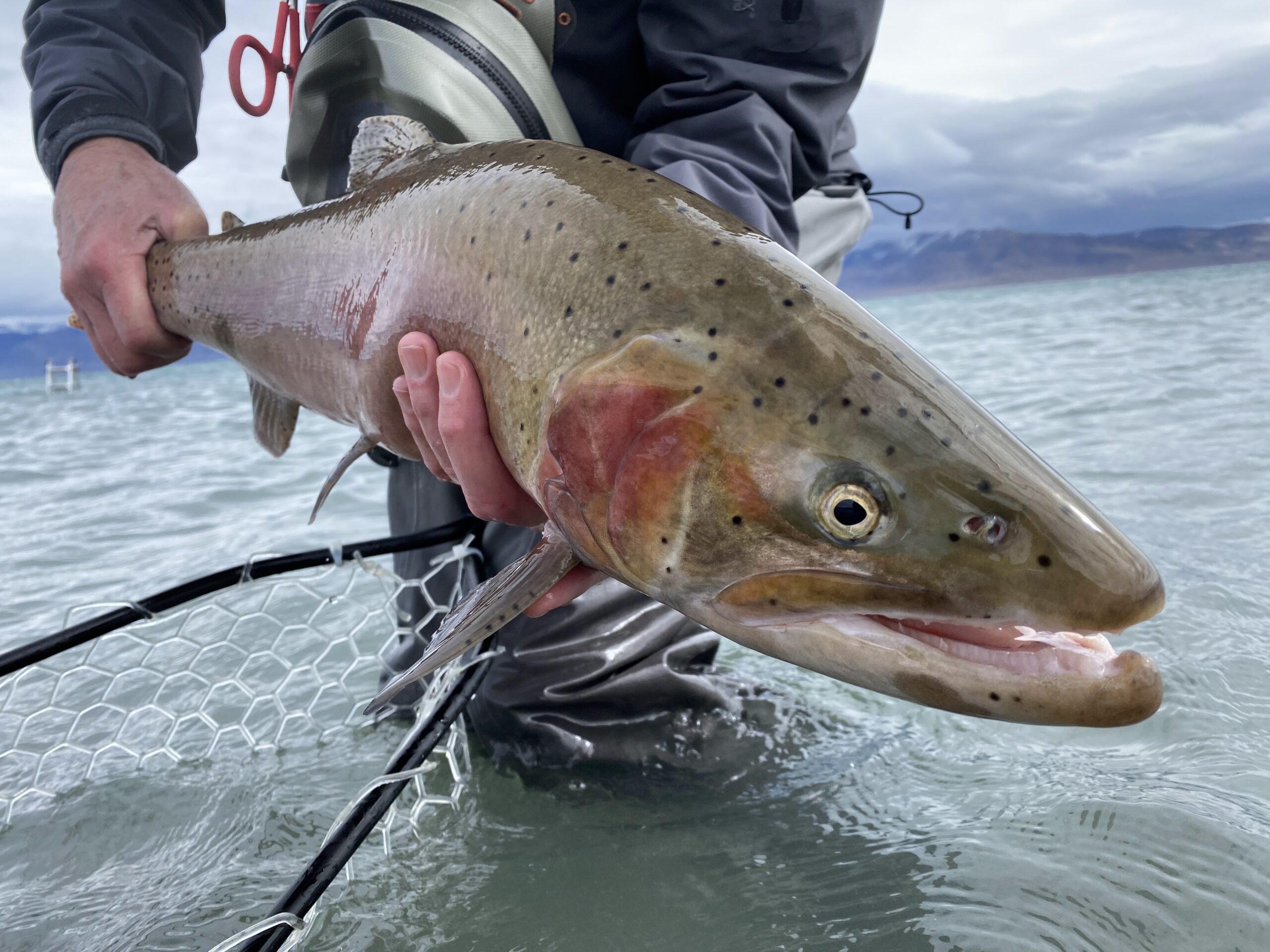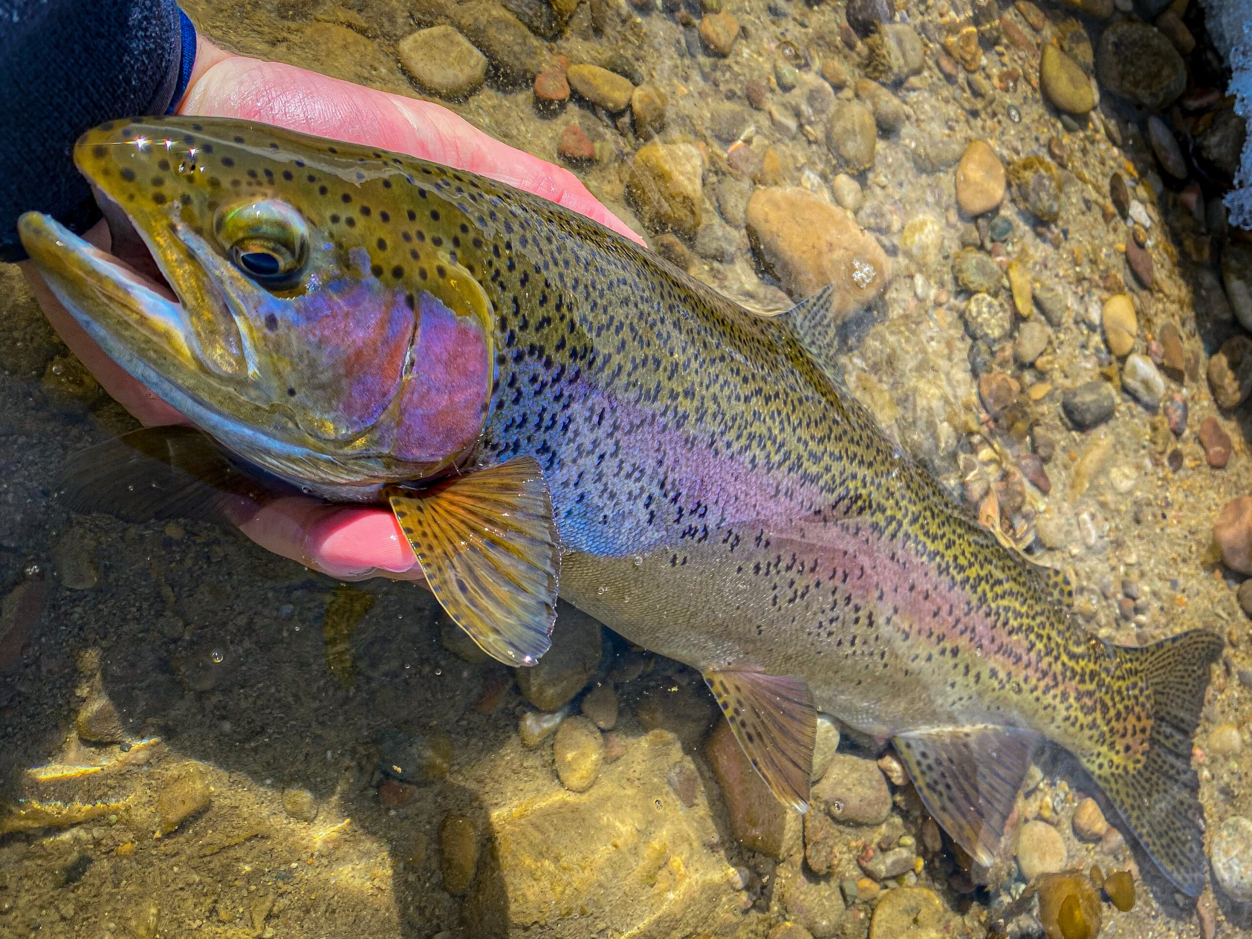 All hail the mighty Blue Pill! I have a lot to say about this fly. I’ve probably caught more fish on this particular pattern during the past few years than any other. During the past decade, balanced leeches of various types became mainstream, and many such patterns have proven deadly in a variety of situations in both rivers and stillwaters. Balanced leeches offer a variety of advantages. Balanced leeches are tied on a 60 or 90 degree jig hook, with a pin extending beyond the eye to attach a tungsten bead that balances the fly. When tied correctly, they ride with a horizontal orientation in the water, more accurately mimicking the behavior of a squirming leech or small baitfish than a traditional fly hung vertically under an indicator. The point of the hook is therefore above the fly body. This results in fewer incidental snags on the bottom, and therefore, fewer lost flies. Additionally, this hook orientation results in an extremely “sticky” fly, as the hook embeds solidly in the roof of the fish’s mouth upon the hook set. I don’t lose a lot of fish hooked with balanced leeches. Additionally, the orientation of the hook usually strikes the fish far from dangerous structures like the gills and lingual artery, resulting in very low fish mortality. But why “blue,” you ask? Well, I could simply tell you that I’ve compared the blue pill with every other color of balanced leech, and it almost always outperforms the rest. From Idaho, to Pyramid Lake, to Alaska, and all the way to Jurassic Lake and other stillwaters of Patagonia, the thing simply dominates. However, the real power of the fly involves physics and wavelengths of light. Physics was never my forte, but I’ll explain my rudimentary understanding of the situation. Shorter light wavelengths, such as red and yellow, are absorbed quickly in water, and don’t penetrate the depths very well. The energy in these wavelengths of light is responsible for the heating seen in the first few feet of the water column, as they are readily absorbed. At a wavelength of about 500 nanometers, blue light penetrates water maximally compared to other wavelengths of light. Materials that reflect blue light (such as those found in the Blue Pill) will be more visibly prominent in deep water, and therefore will appear more noticeable to trout. Honestly, we should probably tying more of our deep water patterns like streamers and nymphs in blue. (Of note, green and blue have similar wavelengths and therefore green is also a good color choice for many deep water patterns. This likely explains why so many effective balanced leeches possess a green or chartreuse bead, even if the rest of the fly is designed in a different color). Whether hung under an indicator or stripped like a streamer, the blue pill gets it done. It is a simple pattern that is easy to tie. Several tying tutorials are available online, and the fly is sold commercially by Snake River Fly Shop in Pocatello (I believe one of their employees invented the Blue Pill). Although the blue pill is effective year round, I find it especially successful during the spring, when ravenous trout will annihilate a juicy leech after an arduous, cold winter.
