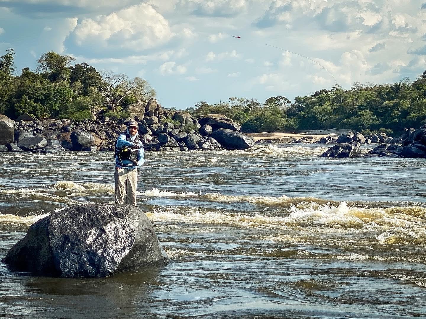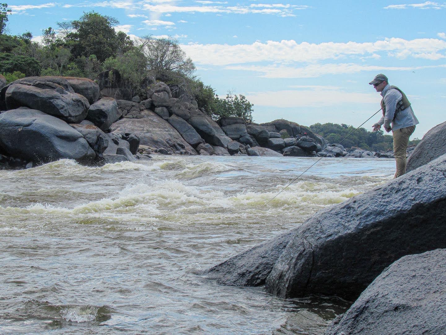 Finally, we reach the first fishing hole. A giant rapid longer than a football field, the spot is impressive. This is my second trip in pursuit of payara, and I know what to do. I strip my entire fly line out at my feet. I make a simple 30 foot cast in to the rapid, and allow the current to pull the rest of my line in to the river. As I start to feel the backing in my hands, I begin to strip the line with both hands, rod tucked under my armpit. Slowly at first as the line comes tight and starts to swing, and later faster to imitate an escaping baitfish, I bring the 12-inch long fly back to my feet, and repeat.