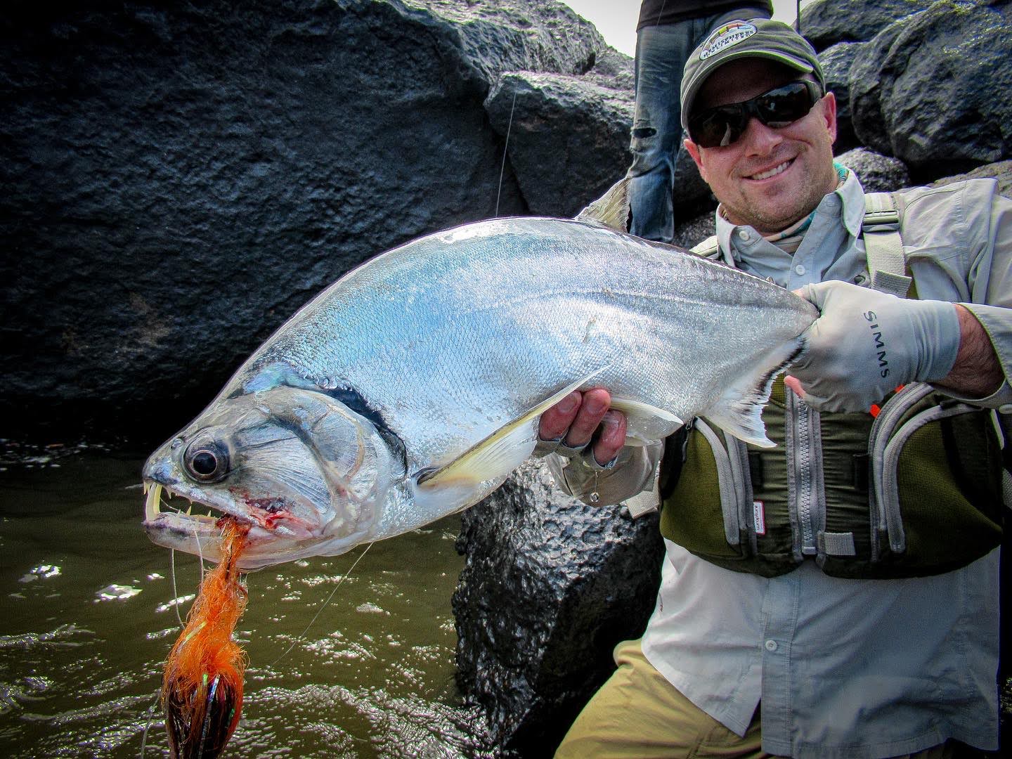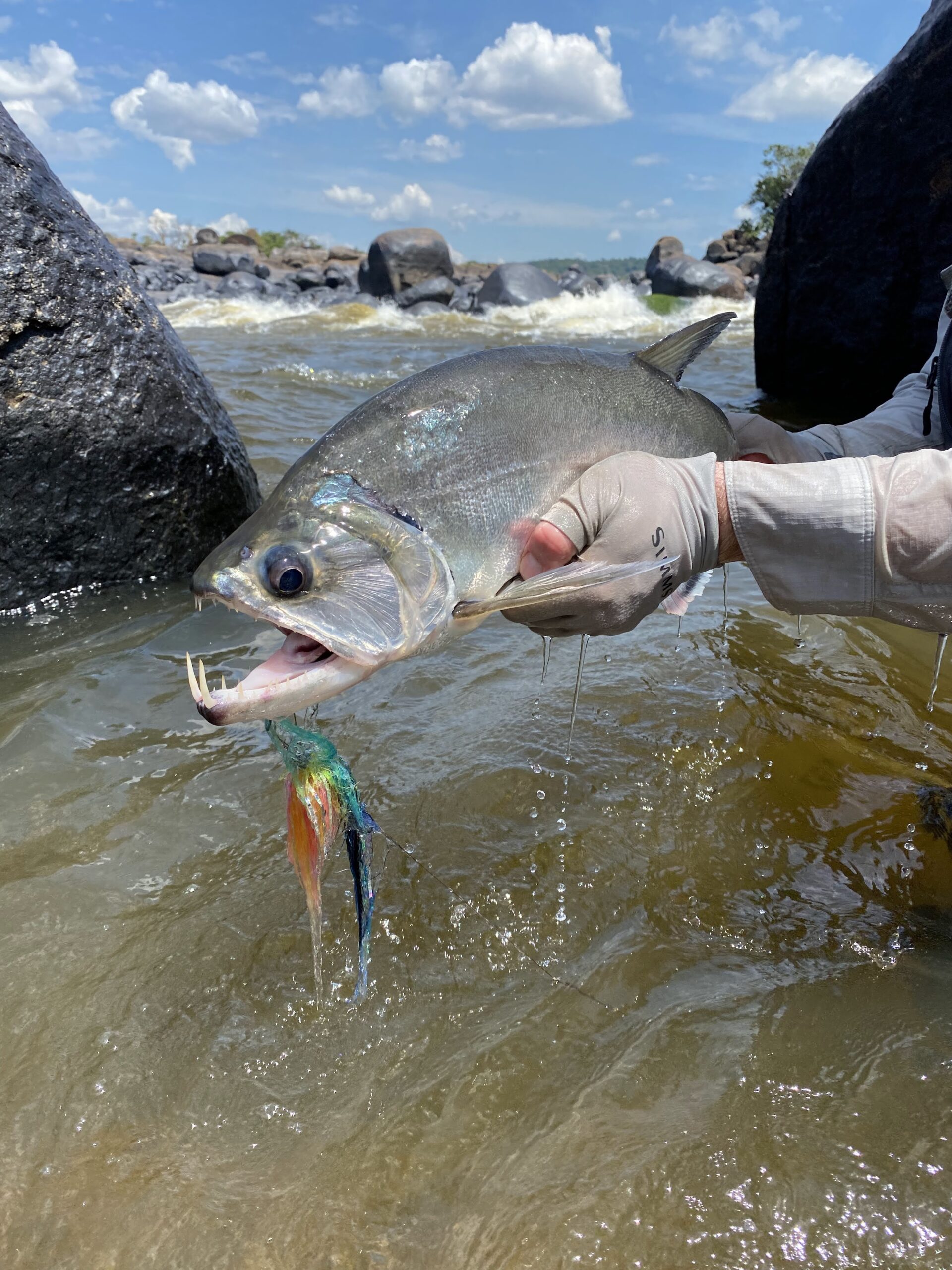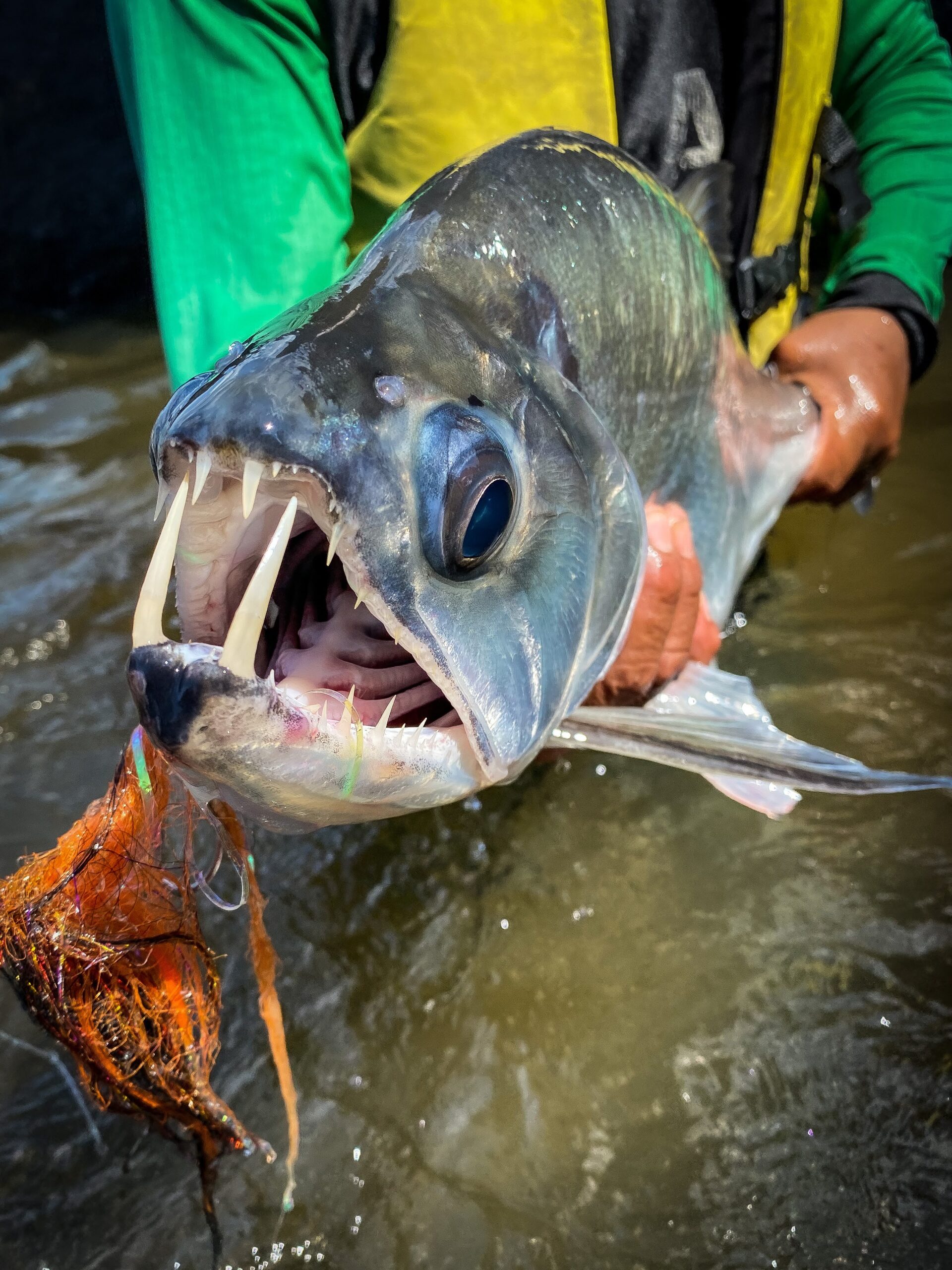 I’m able to crank the fish in on my overmatched 10 weight. I jump off my perch above the river in to the water, and bring the fish to hand. The creature is beautiful. It is perfectly adapted to its role as a top dog on the mighty Orinoco. With a powerful tail to navigate the rapids, formidable teeth to slash at baitfish, and a sleek profile with a razor sharp section on its belly to avoid attacks from even bigger dogs, I know I’m holding something special.