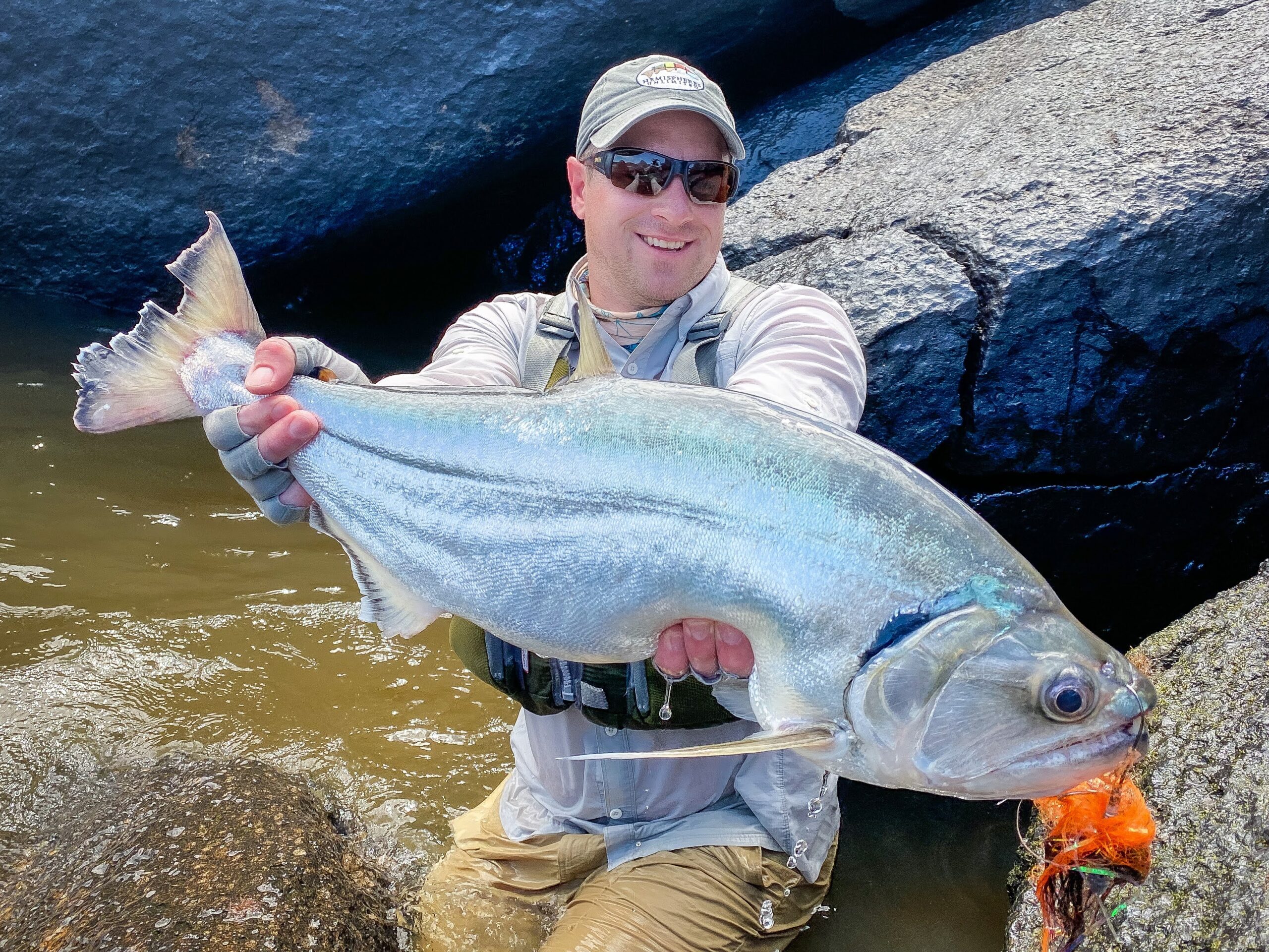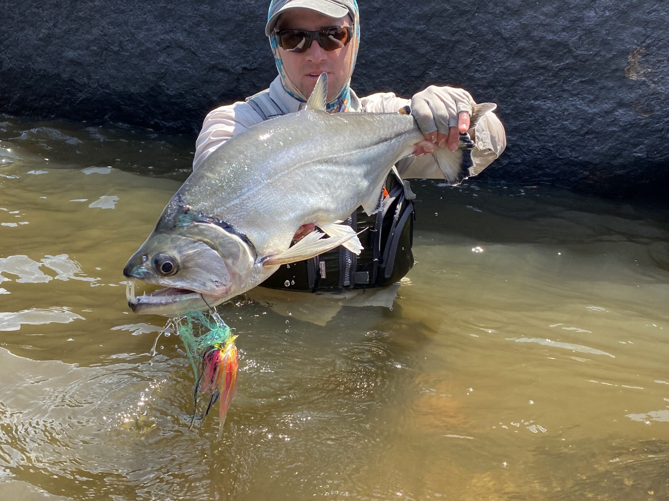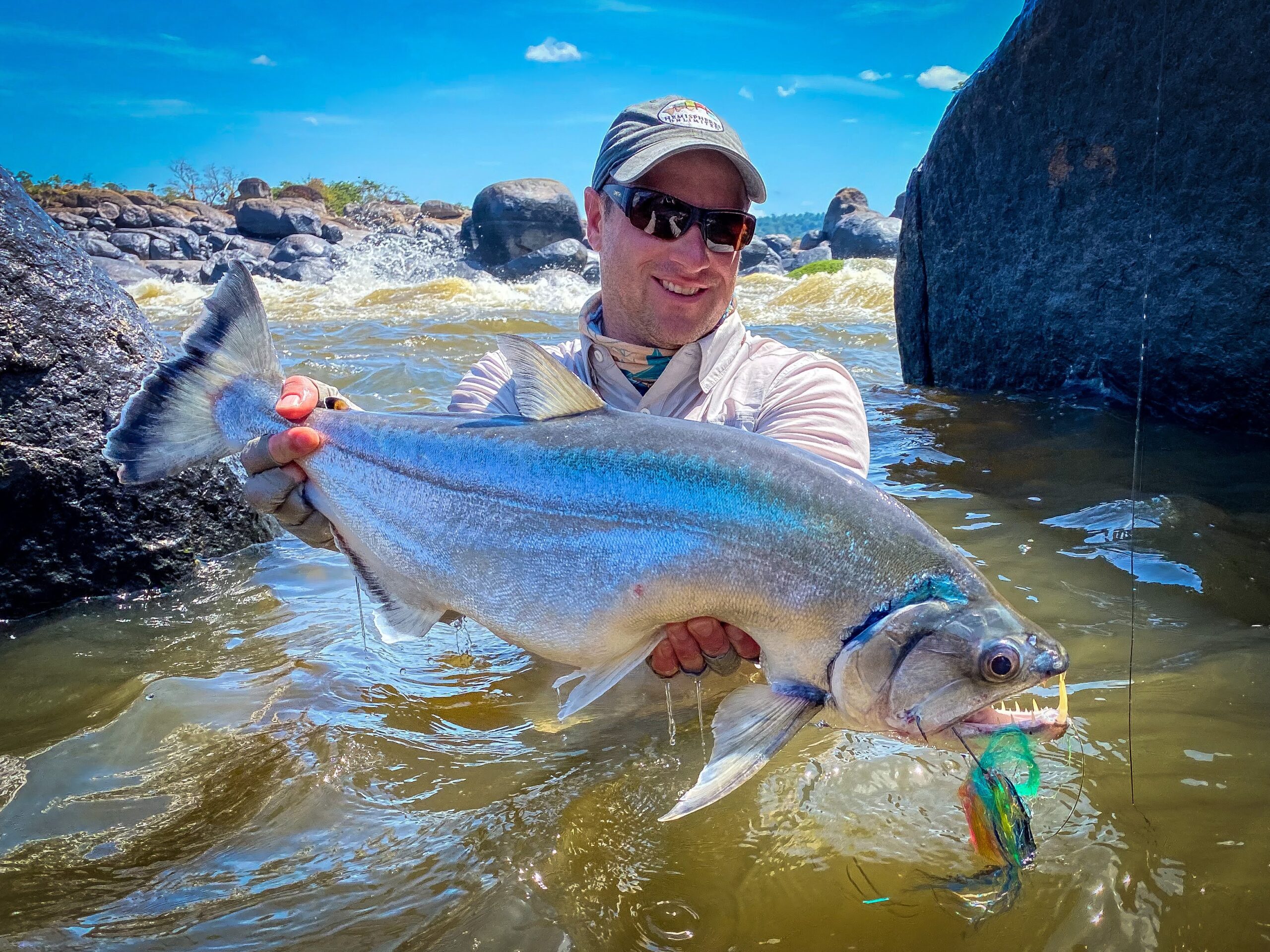 We first meet just five minutes later. I feel the telltale thump at the end of my line, indicating that I’ve found an interested payara. I set the hook hard with both hands, and continue to pull until I can’t pull any more. The payara starts to win the battle, and takes off downstream. I tighten my drag to the max, and I’m still losing. The fish continues to take line, and I meet a part of my backing that I’ve never seen before. As the payara literally starts to turn the corner on the river below me, I realize my only play is to clamp the reel with my palm or I’d risk losing my brand new fly line. As I do so, I nearly get pulled off the rock on which I stand. I know if I can weather the insane initial 60 seconds of a fight with a payara, I can likely land it as it starts to tire.