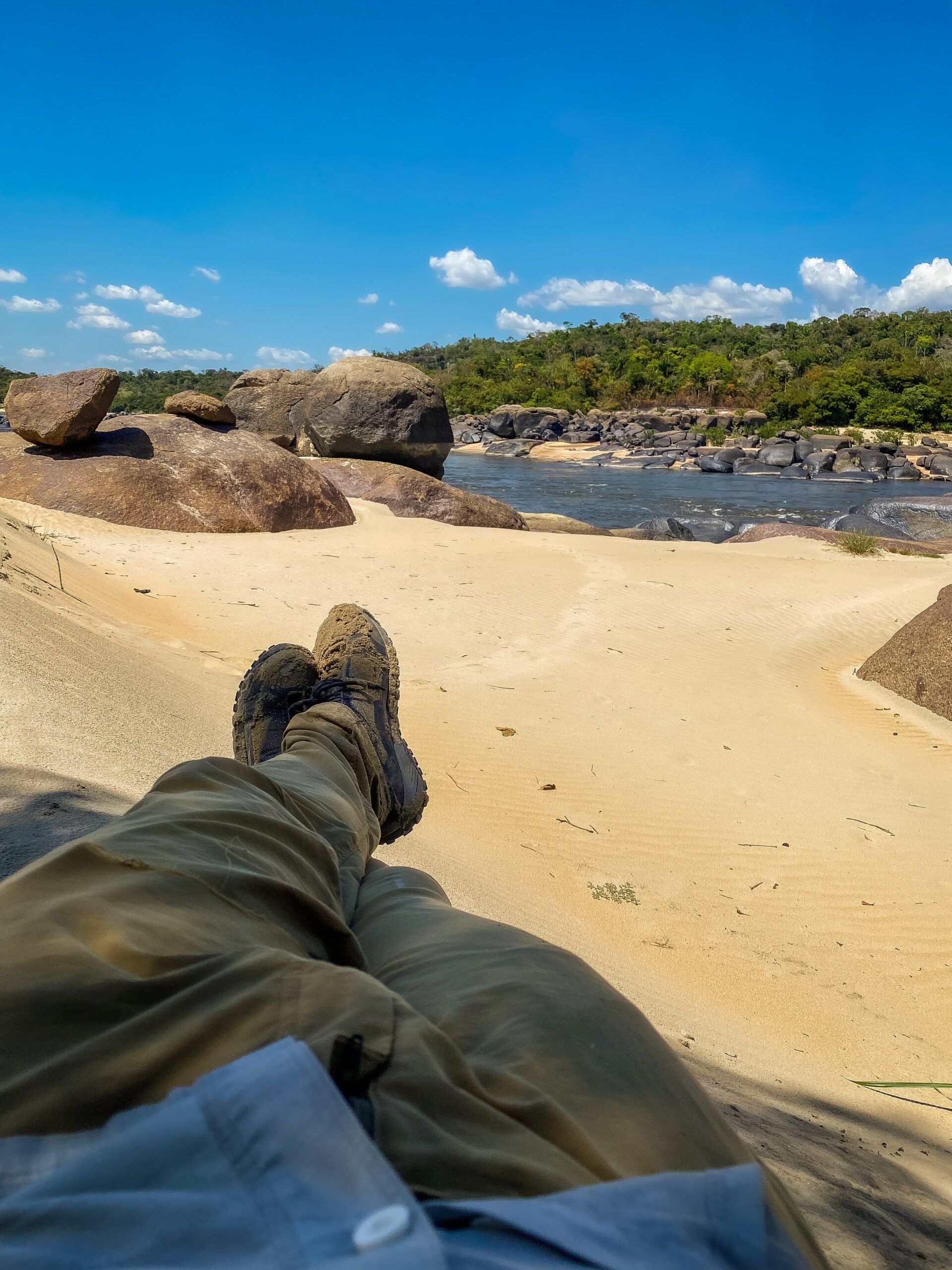The dry season yields empty channels that we can navigate by foot. We follow Silvio through one of these channels, over massive boulders and up steep hillsides of sand. The hike is maybe a half mile, but feels like five under the unrelenting sun of the Amazon. We are now several miles in to the troubled country of Venezuela. Without a visa, the legality of our actions is questionable, although the border is not strictly enforced in this indigenous territory. We’re told that as long as we hang with Silvio we should be good, and we are. While jumping off a boulder, my brand new pants literally tear in half. I try to repair them, but despite my efforts I’m left with a pocketed loincloth in which to fish for the rest of the day. My legs pay the price exacted by the relentless sandflies.