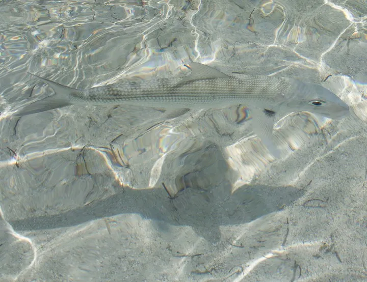 The bonefish is an elegant and easily frightened species. They have an elongated body roughly the length of your forearm. They are called bonefish because of their numerous little bones. The fish is purposefully using its slim snout to dig in the sediment and seagrass for crabs, shrimp, and other good things to eat.