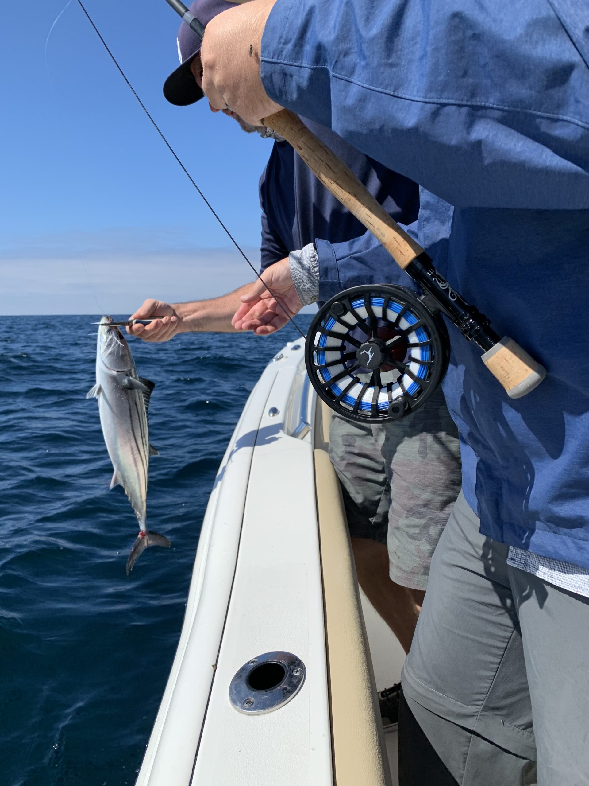 We all looked at each other with stunned belief and we knew our day of fishing had just begun. I grabbed the 10wt already rigged with a sardine fly pattern and gave it a cast out. Let it sink, count it down, 8,9,10, and began a twitching strip in. Dave kept the boat a steady, a slow, crawl where the bait was still visible on the fish finder. BOOM! A strong hit, a good strip set, and I’m on! Then Sam yelled “doubles.” We were both on within seconds of our casts. While both fish were making their runs, and both of us giving them no slack, I learned something new: the boat dance of “over…under.” Me, being new to pelagic salt water fishing, had no idea how fast a boat can become so small when you have multiple anglers hooked up at once. Sam quickly said “under” while he darted under my line and he swiftly got to the port side as his fish made a run that way. I promptly got the hang of this “tango” and yelled “over” when I need to change positions to fight my fish. My first Bonito, I’m going to say 3 pounds (it was totally less than that) was landed on a fully bent out 10wt. I couldn’t believe the fight this little fish gave. The runs it made with the line cutting through the water! I released him back to the ocean and I was ready for more.