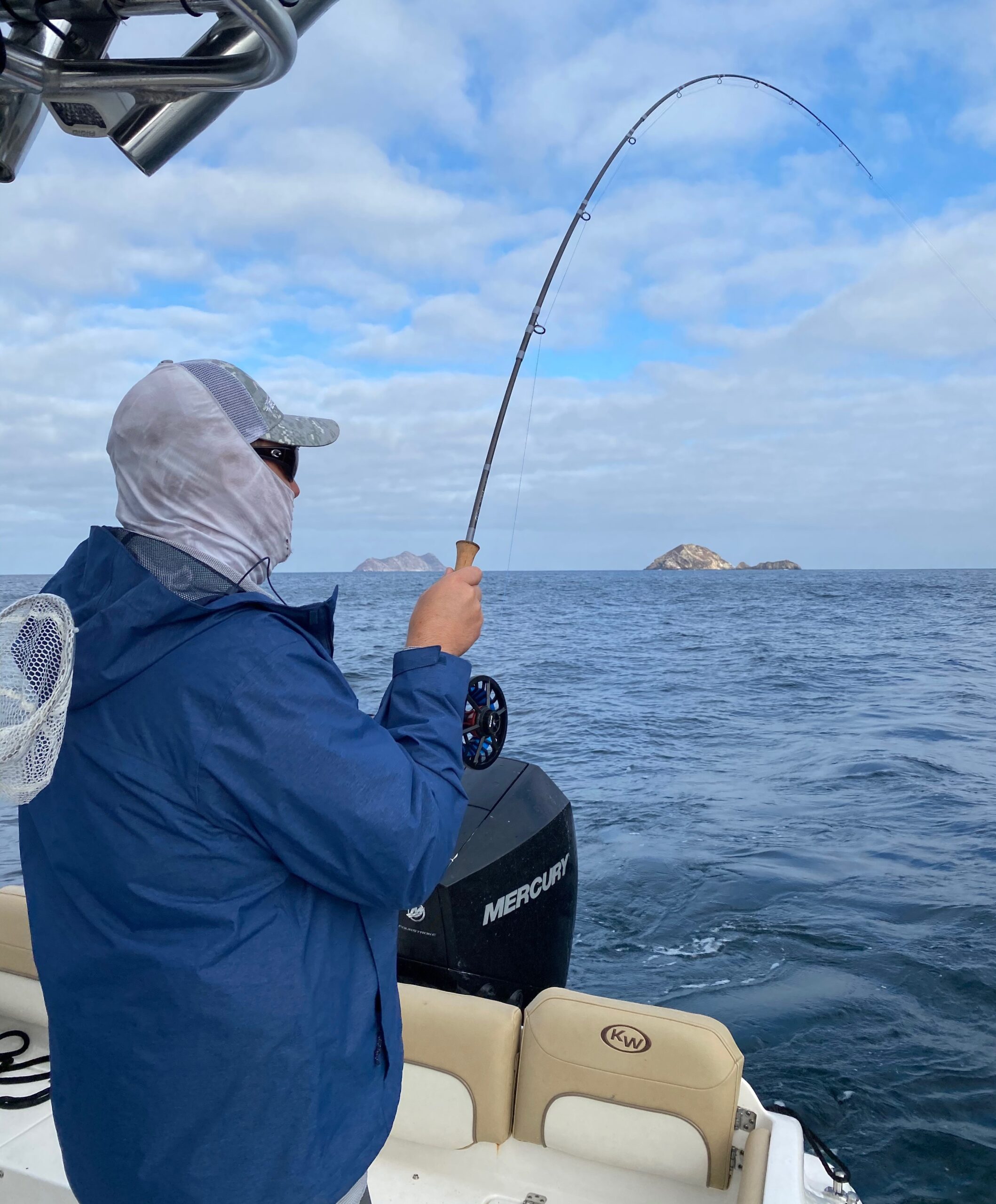 Everyone stunned and turned to watch Kevin with a 12wt rod fully bent over and reel screaming pulling out line. “What is it?” Our rods where set up for tuna, so we new the drag was set tight. This fish made long runs and some deep dives. Kevin handled it like a pro, letting it run when it needed to and reeling in fast not giving the fish any slack. After what seemed to be longer than a 7 minute fight, all of us at the stern of the boat, looking down, we all saw the color – it’s a Bonito! Kevin had fought and landed a 3 pound, 3ft Bonito on a 12wt with a full bend. None of us have caught a Bonito on a fly rod before and we couldn’t believe the fight the fish put out.
