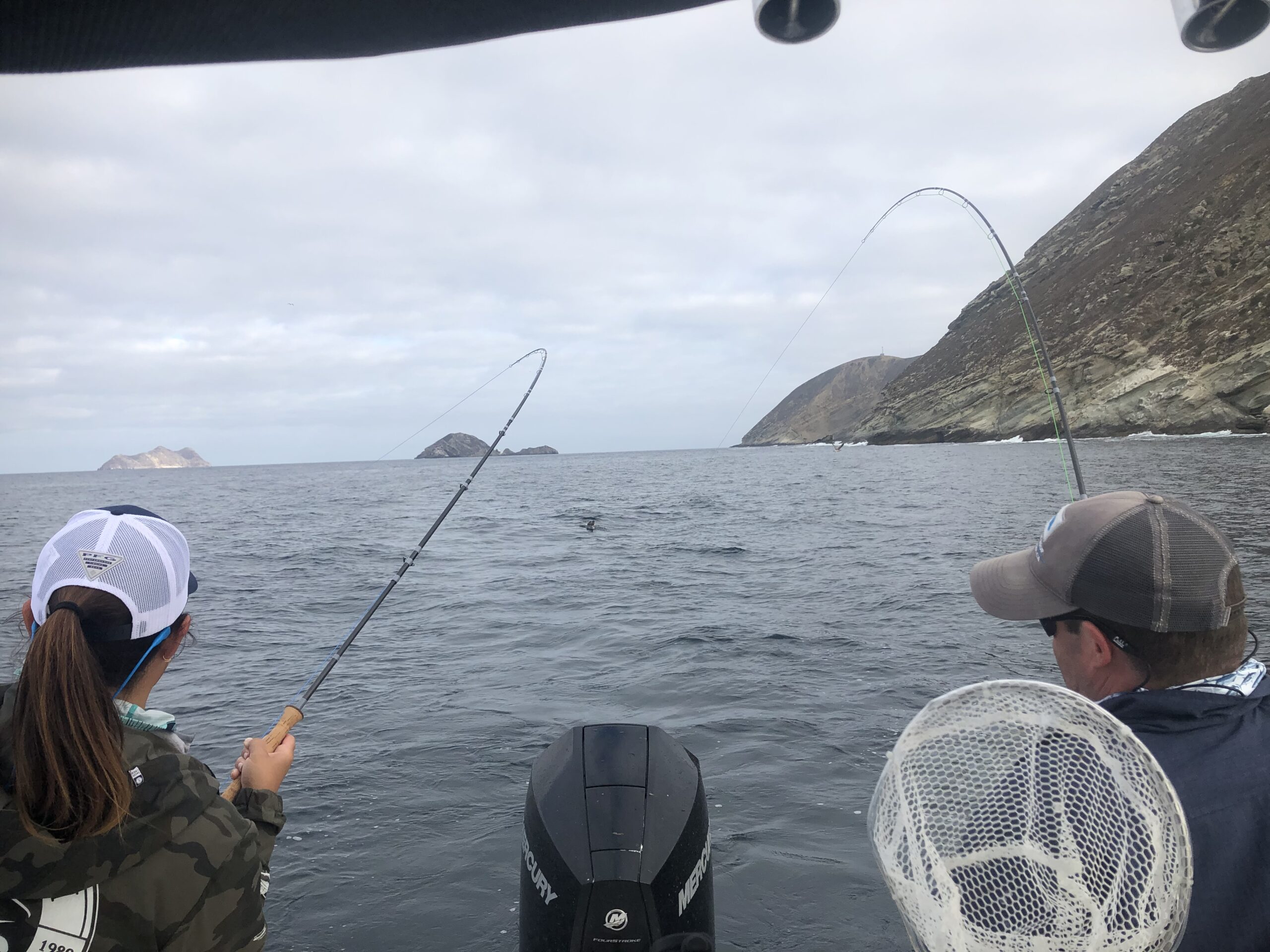 All day we did the tango of setting the hook, fighting the fish, and over/under. It was fantastic. Cast after cast, we were hooking up. But we weren’t the only predators out there fishing for Bonito. Suddenly, a seal showed up. It reminded me of this situation: just like when you’re trout fishing on a river and an unknown angler shows up below you, and you begin to rail on fish, and they aren’t catching a thing….so they low hole you. Yep, that seal low holed us! , We did the hard work of catching the Bonito and the seal did the easy work of eating the Bonito. I learned quickly, when the fish was done running, I reeled in as fast as I most possibly could. No messing around, get the fish in the boat, so I could release it back into the ocean not attached to hook and no seal chasing it.