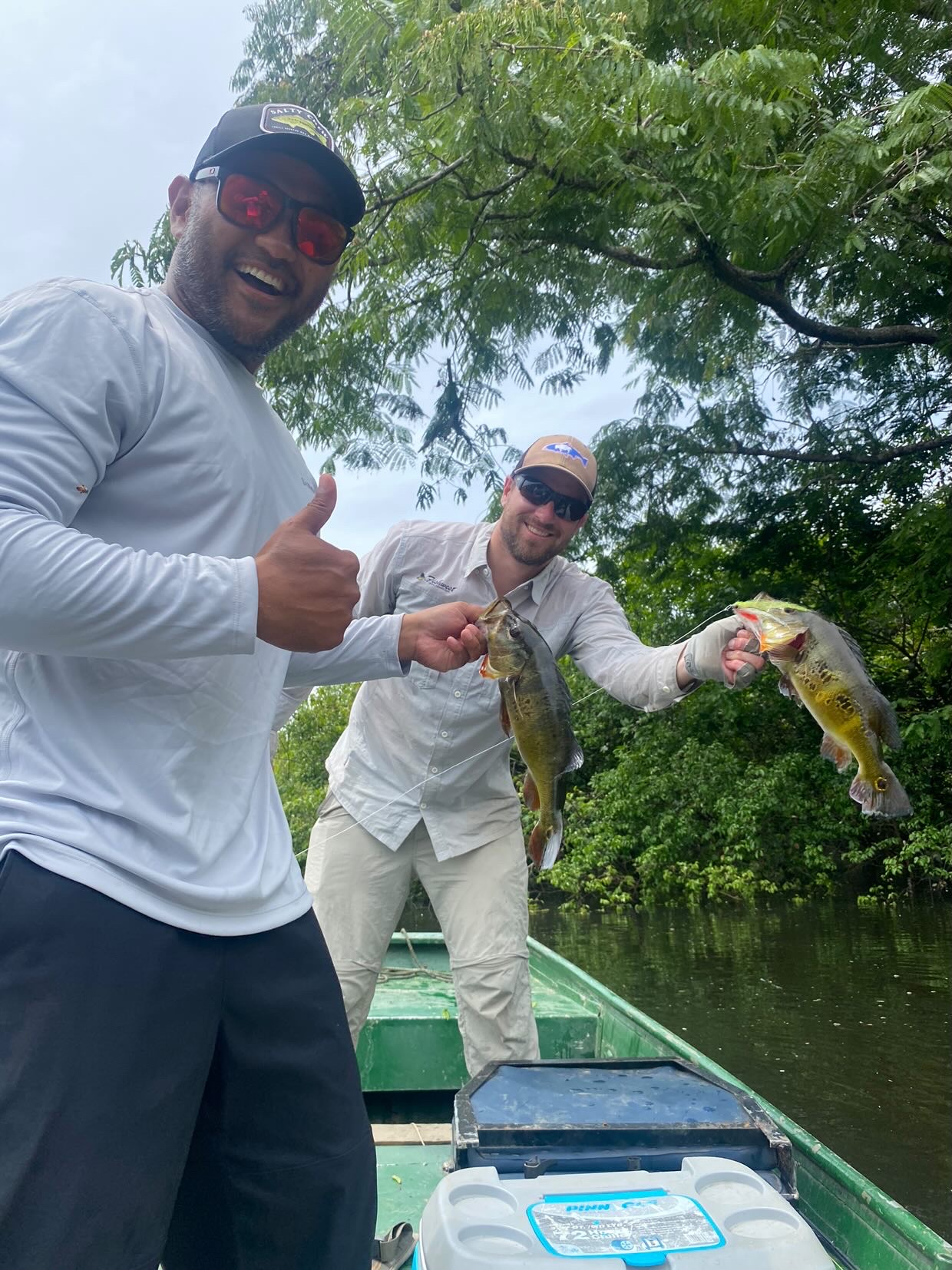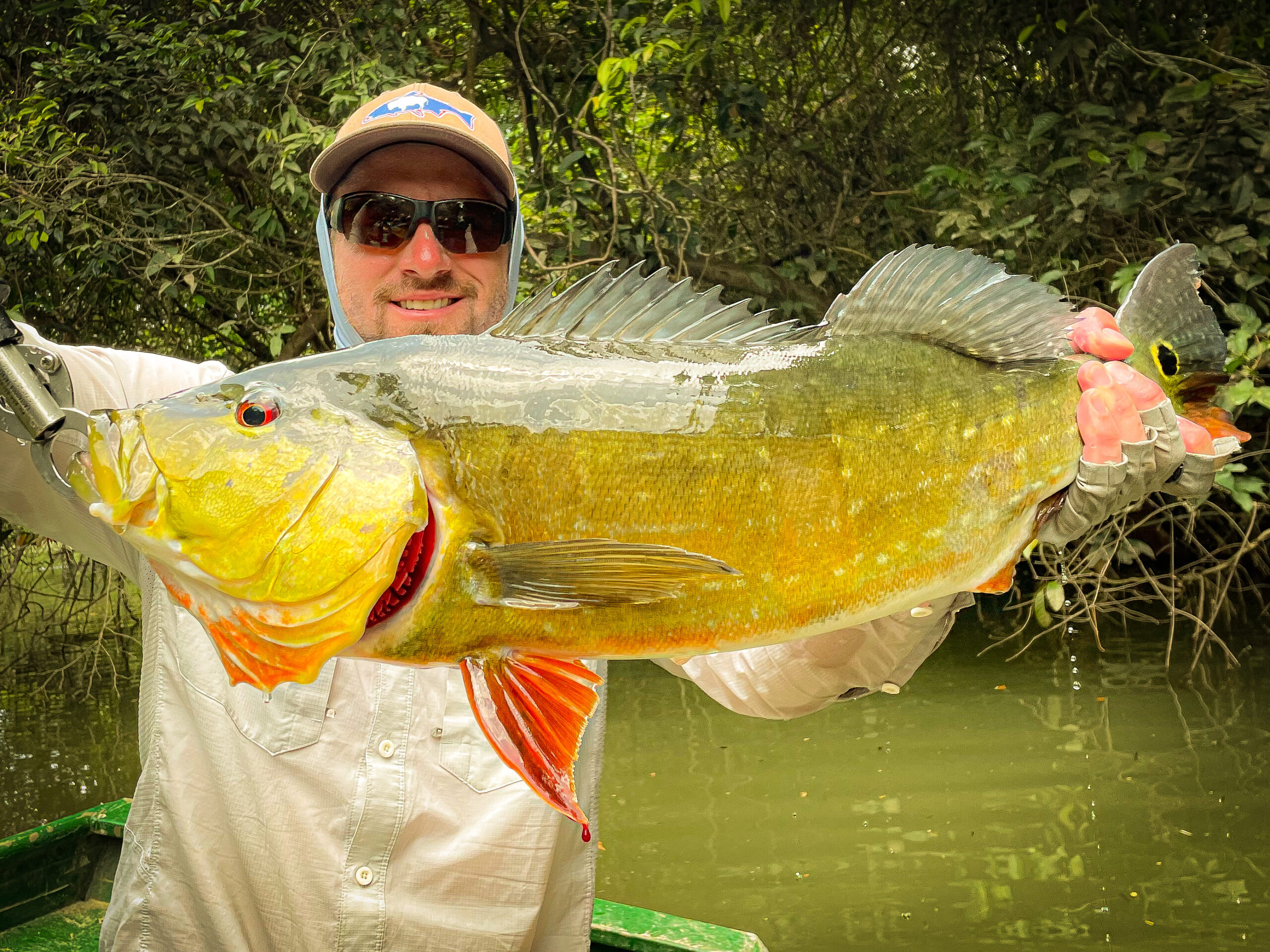 - There is a reason you see pictures of so many peacock bass doubles. When one fish is hooked, the other fish in the school often become hyper-aggressive. One fish flailing on the end of a line seems to trigger the feeding frenzy response in adjacent fish. When fishing two anglers to a boat, after the first angler hooks up the second angler should immediately throw their line next to the hooked fish. More often than not, the mayhem of a peacock bass double will be the result.