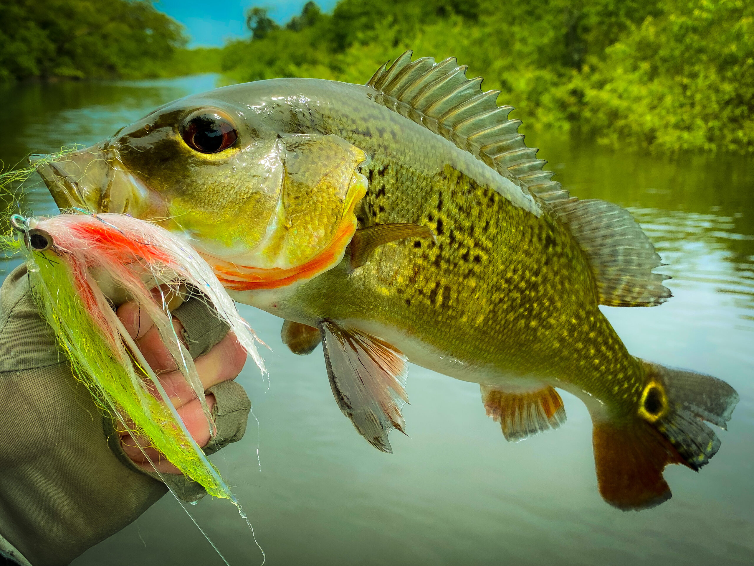 The tippet used for peacock bass is very simple. I use a 3-foot piece of straight 60 lb fluorocarbon. There is some risk to this strategy, as it could put the 50 lb core of the fly line as the theoretical weakest link. However, if the angler keeps the fluorocarbon leader fresh, any sort of line breakage is extremely unlikely. When I traveled to the jungle for the first time, I broke off more large peacocks than I’d like to admit. I quickly learned that I could mostly avoid this problem if I switched out my tippet frequently. Any sort of abrasion or defect to the leader will spell disaster in a battle against a big peacock. I always check my leader after an encounter with a piranha, or if I get stuck in the wood. I liberally replace the tippet if there is any sign of wear or tear.