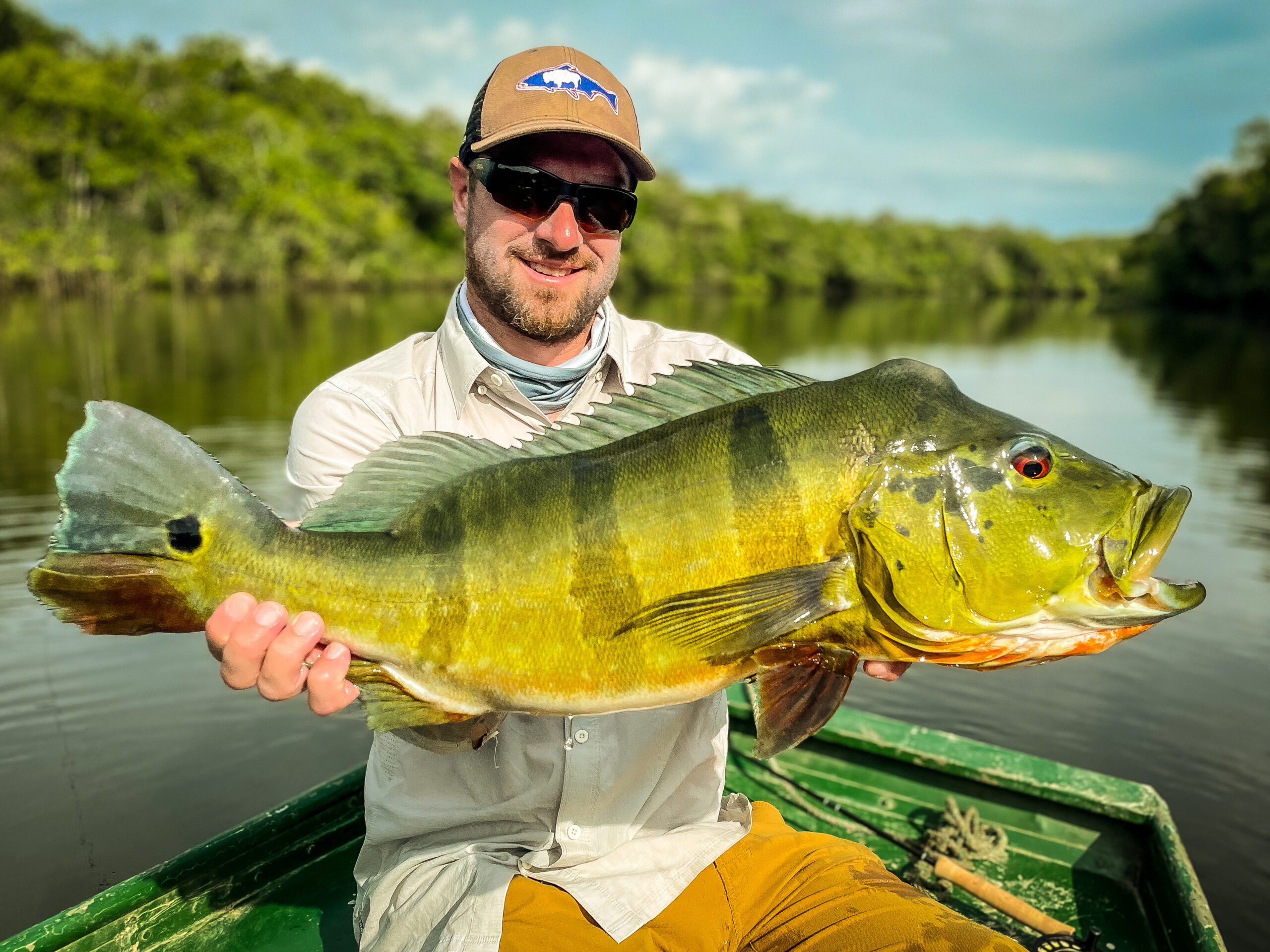 The reason peacock bass and North American bass mirror each other in appearance results from the fact that they inhabit similar niches in their respective environments. There exist 16 known subspecies of peacock bass, all of which originally hail from the jungles of South America. While they have been transplanted to Central America, Hawaii, and Florida, the best peacock bass fisheries remain in the Amazon and Orinoco river basins. Of the peacock subtypes, the most heavily pursued is the Speckled Peacock Bass, or Cichla temensis. These apex predators grow to well over 20 pounds, aggressively smash a variety of flies, and pound for pound fight harder than almost any other freshwater fish. Peacocks are considered by many to be the very best freshwater species of fish to catch on a fly rod. Smaller species such as Cichla orinocensis, Cichla nigromaculata, and Cichla intermedia will frequently keep rods bent while the angler searches for an encounter with a larger Cichla temensis.
