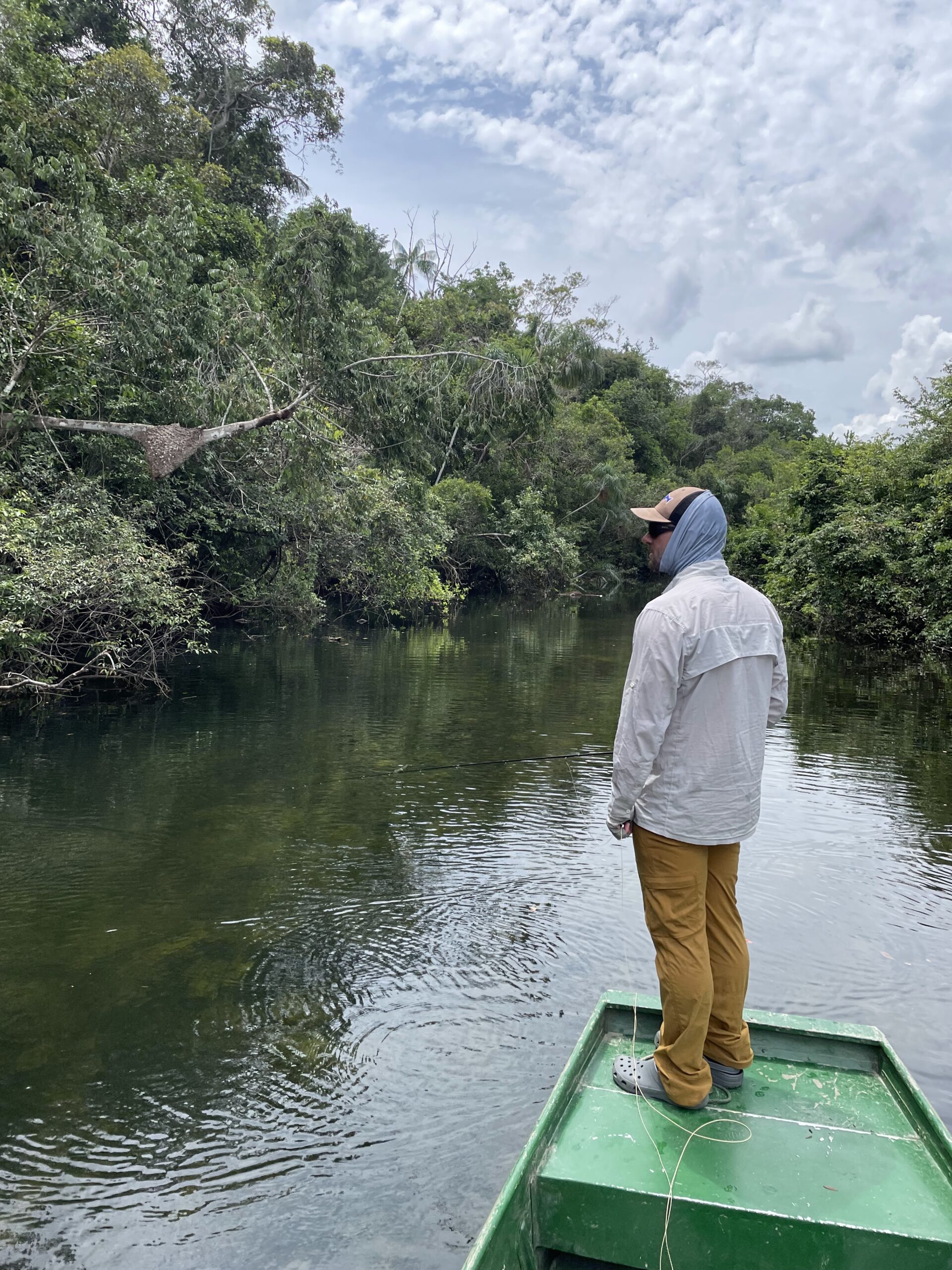 - Clothing: Selecting proper clothing is key to enjoy a week in the jungle. Lightweight, breathable clothing is a must. Skin exposure should be kept at a minimum for protection against the intense equatorial UV rays and multiple varieties of biting/stinging insects. The Simms Bugstopper Hoodie for men or women, checks all the boxes for a week of jungle fishing.