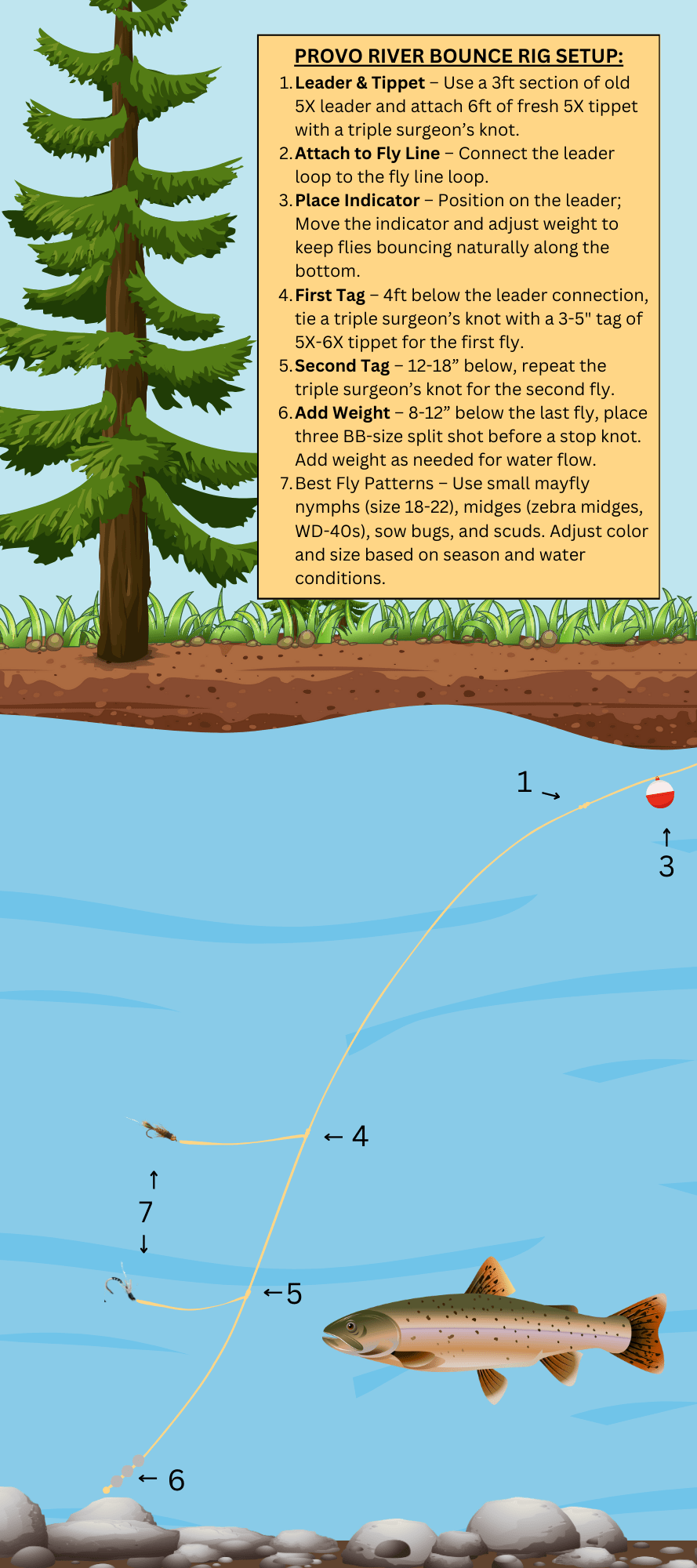 When it comes to nymphing the Provo River, one of the most effective techniques is the bounce rig—a setup designed to keep your flies bouncing naturally along the bottom, right where trout are feeding. Whether you’re a seasoned angler or new to fly fishing, mastering this rig can significantly improve your catch rate.