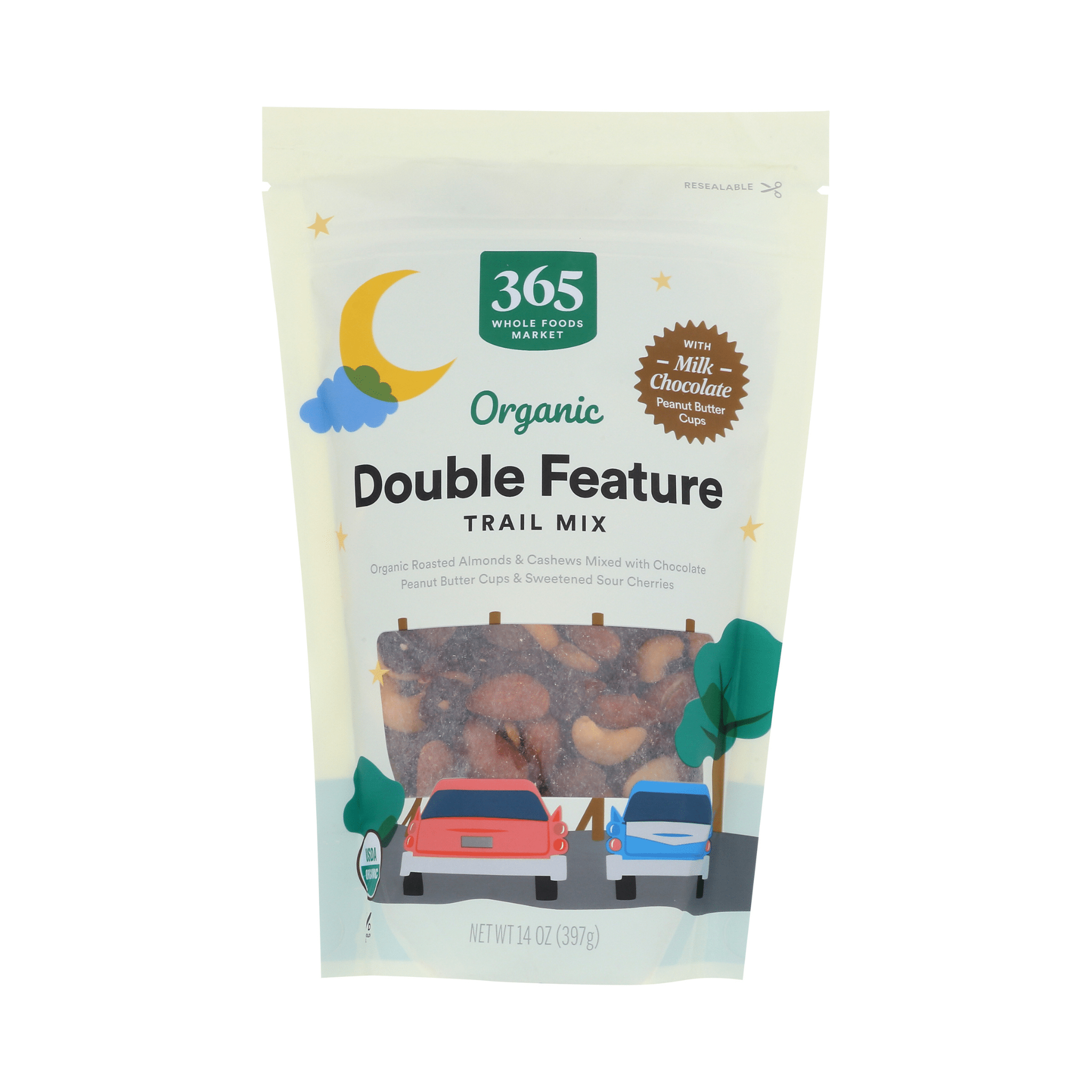 - Whole Food’s 365 Double Feature Trail Mix contains almonds and cashews, along with sweetened sour cherries and milk chocolate peanut butter cups. The inclusion of sour cherries is rather unique when comparing different trail mixes, and they add a pleasantly tart note. Meanwhile, the chocolate peanut butter cups provide the perfect sweet and salty combination, enhanced by the other nuts.