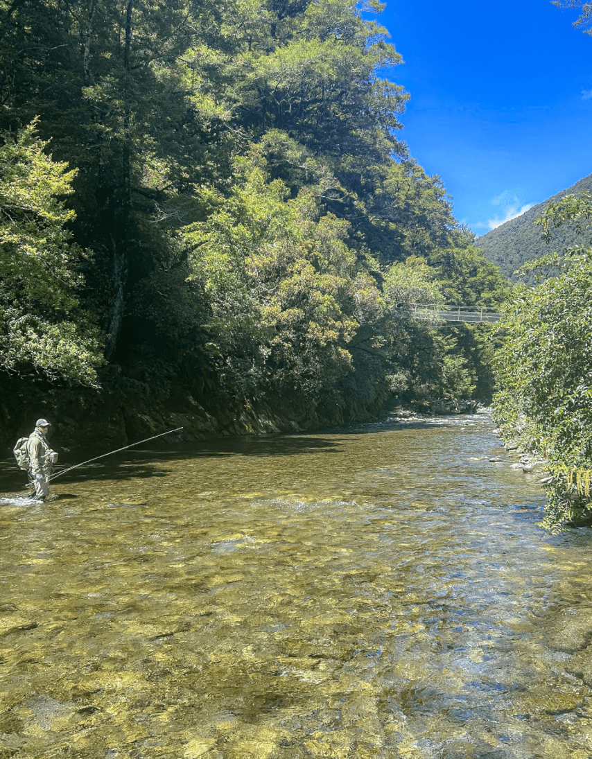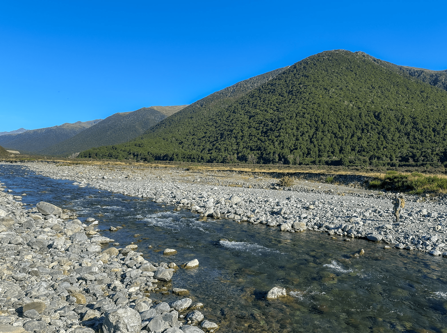 Instead of blind casting, a slow and deliberate approach to sight fishing is the way to go. I like to slowly creep up the river, utilizing boulders and high banks to gain vantage points. Despite the large size of the fish and the fantastically clear water, they can still blend into their surroundings in an uncanny way. However, sight fishing is a skill that can improve with reps, and after some time on the water I felt like I could spot most of the fish before spooking them. Not only is sight fishing massively enjoyable in the South Island, it is really the only way to effectively fish many of the rivers.