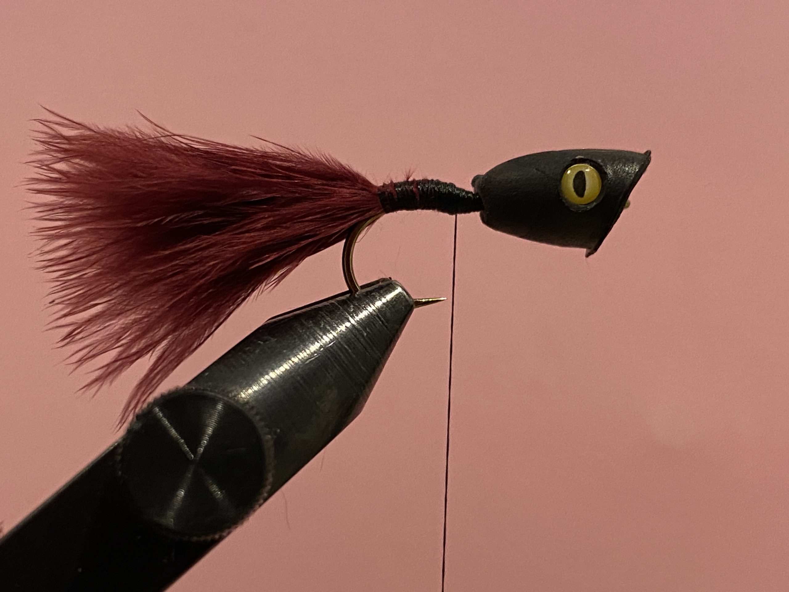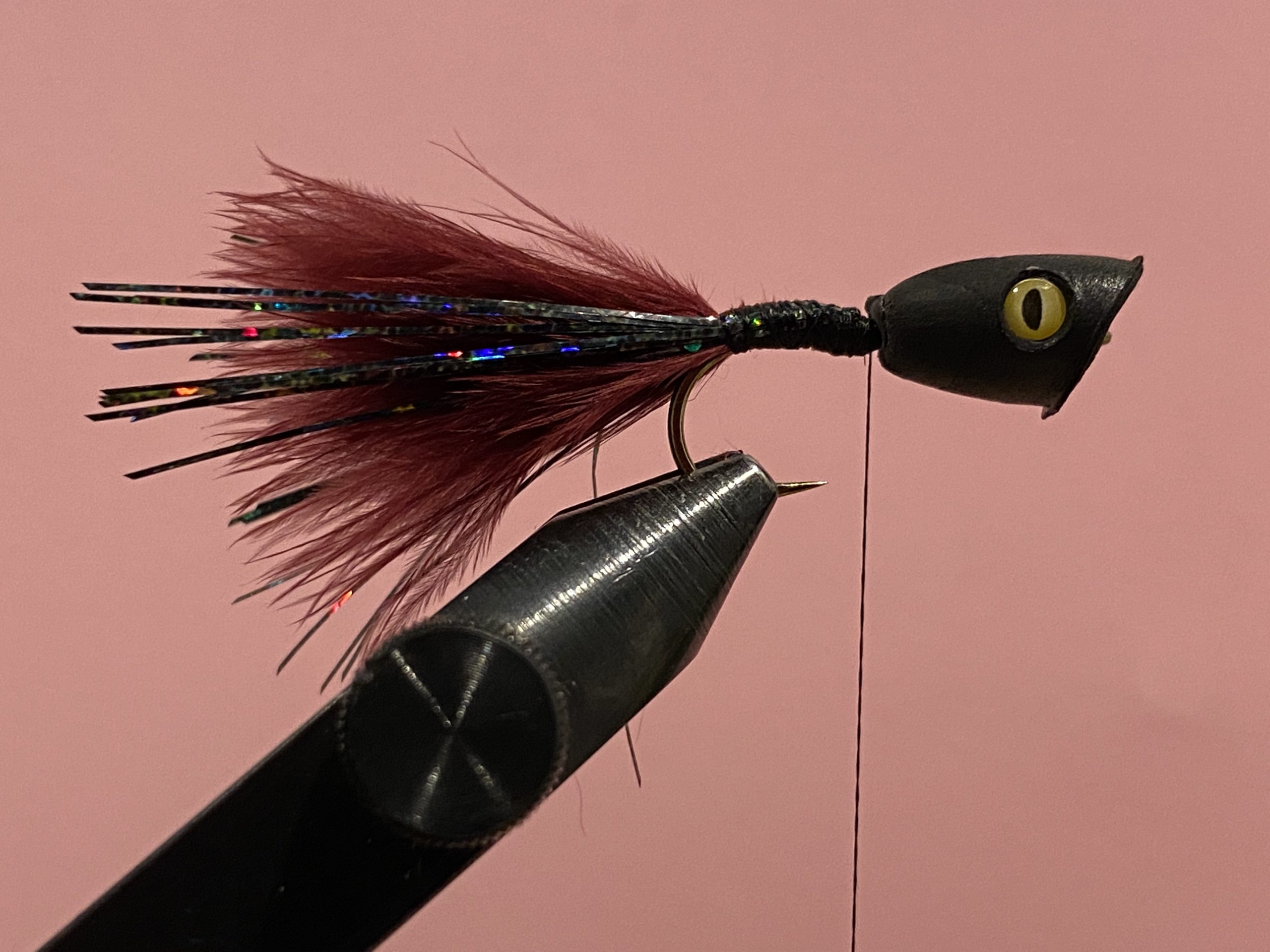 Poke a needle or threader through the popper body and pull a few legs through the popper body and trim them to whatever length you feel is appropriate – longer legs work well and can always be trimmed shorter on the water if you want.