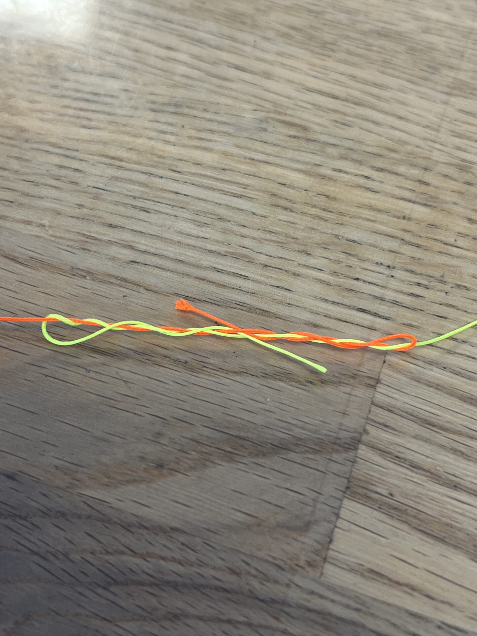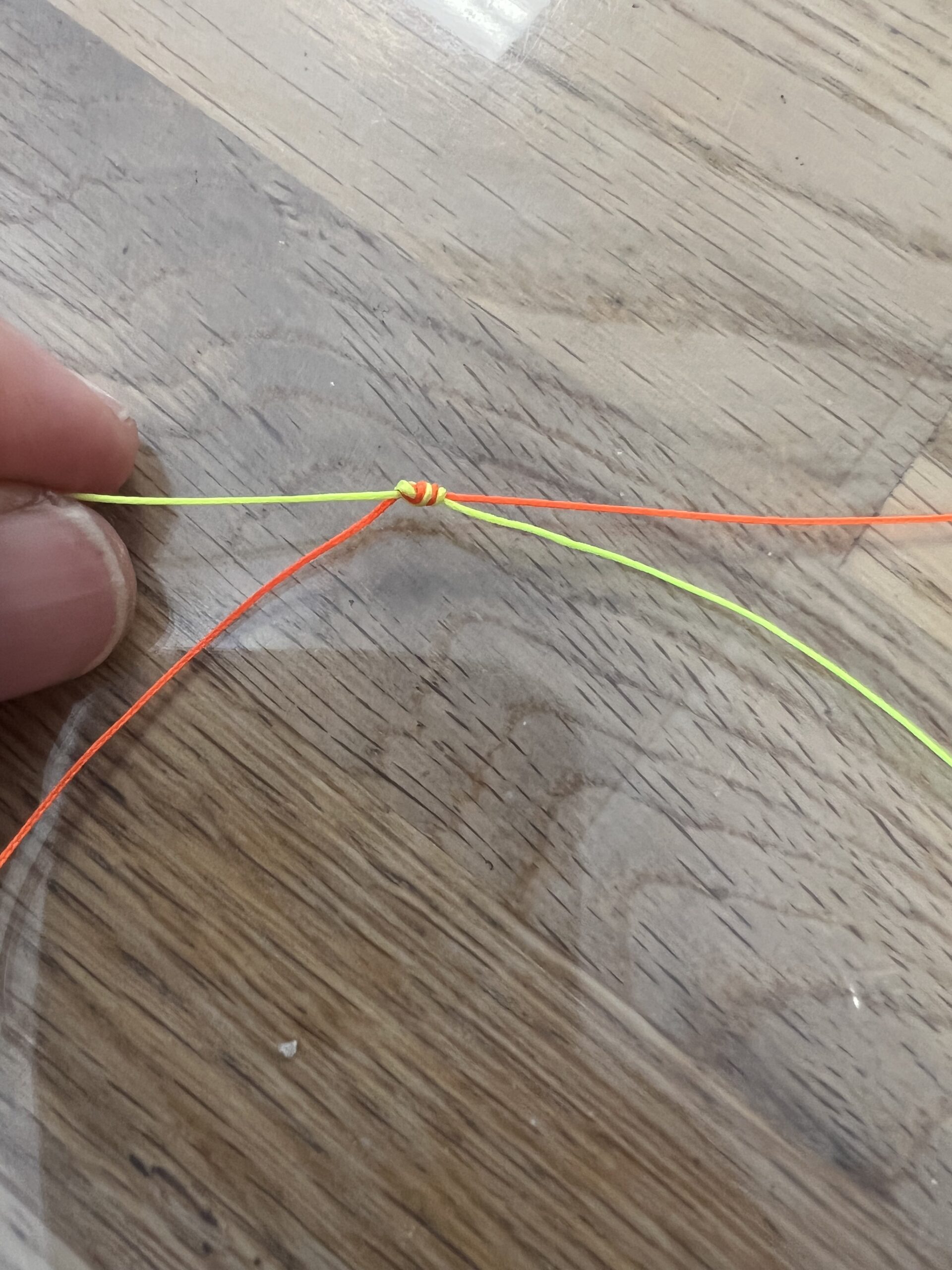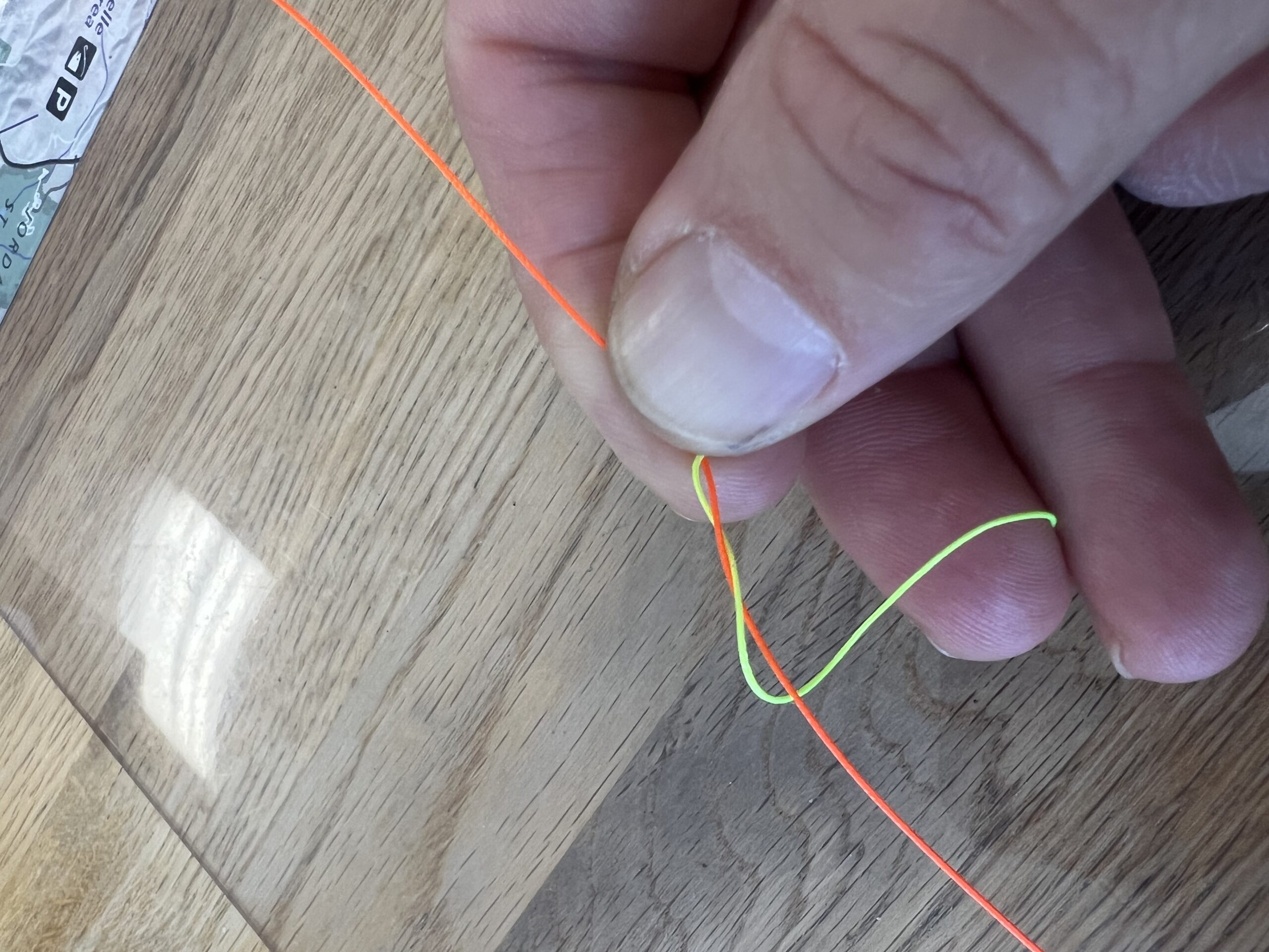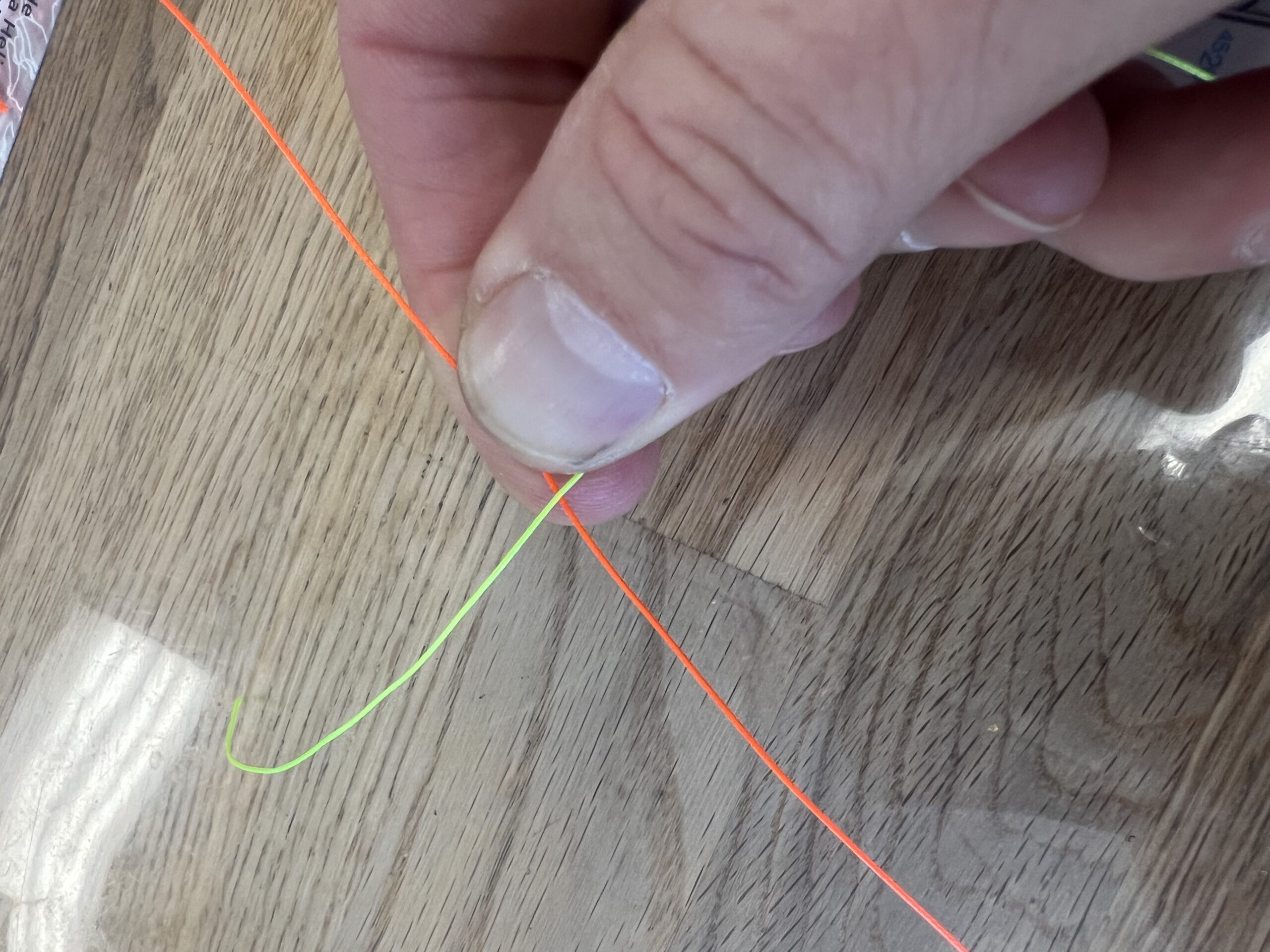 - Cross the leader (orange) and tippet (yellow), pinching where they intersect with your thumb and index finger.