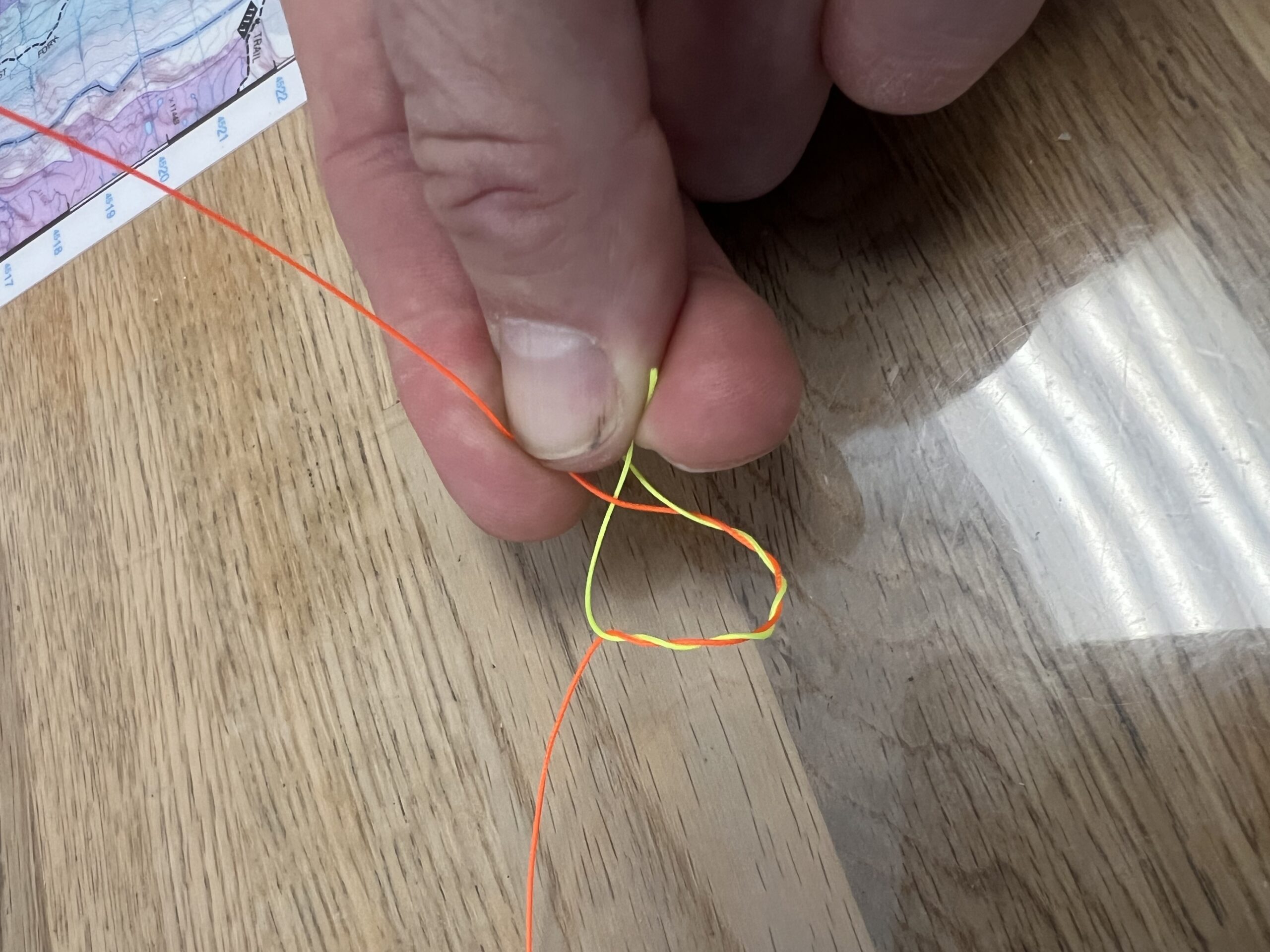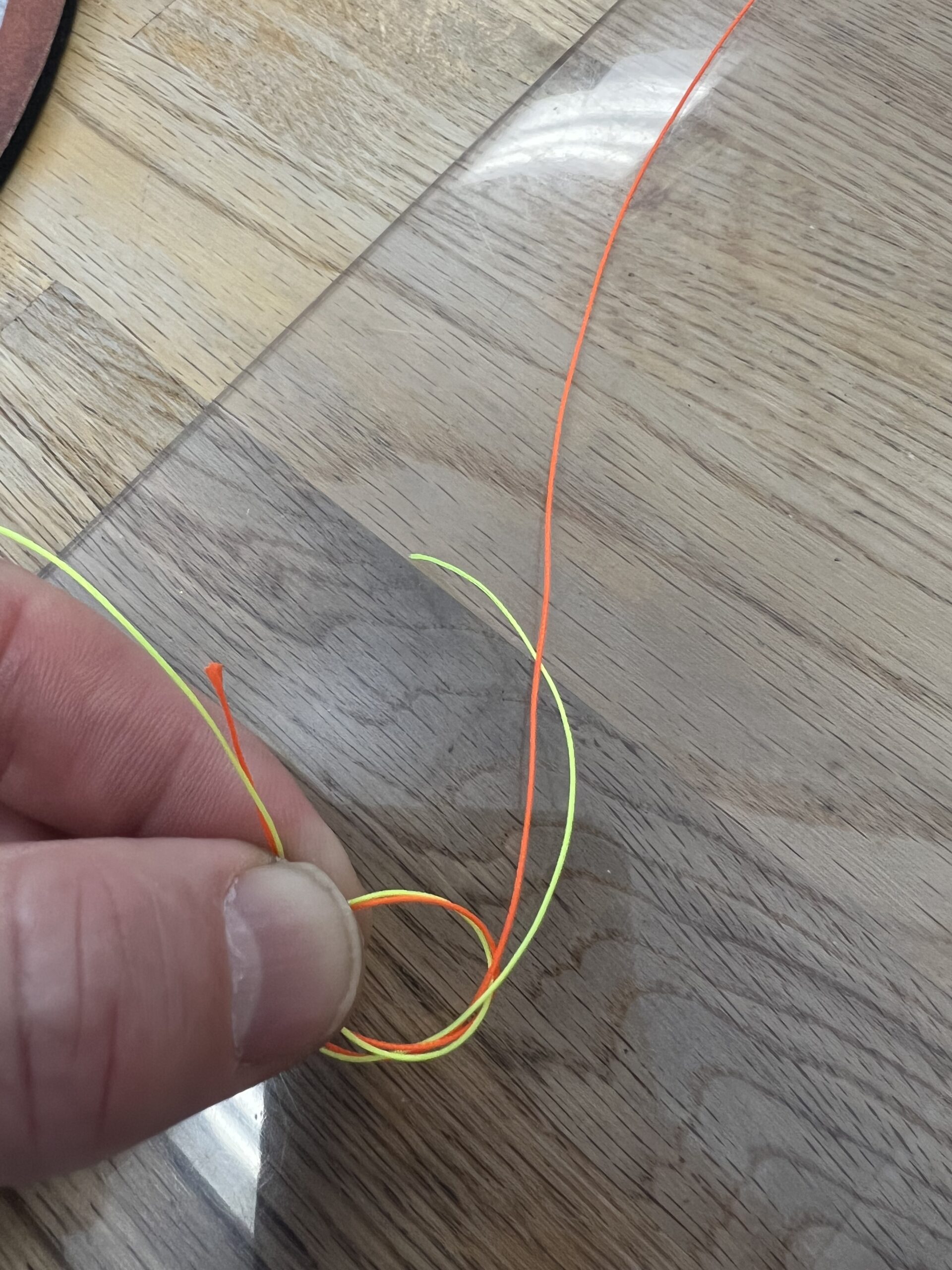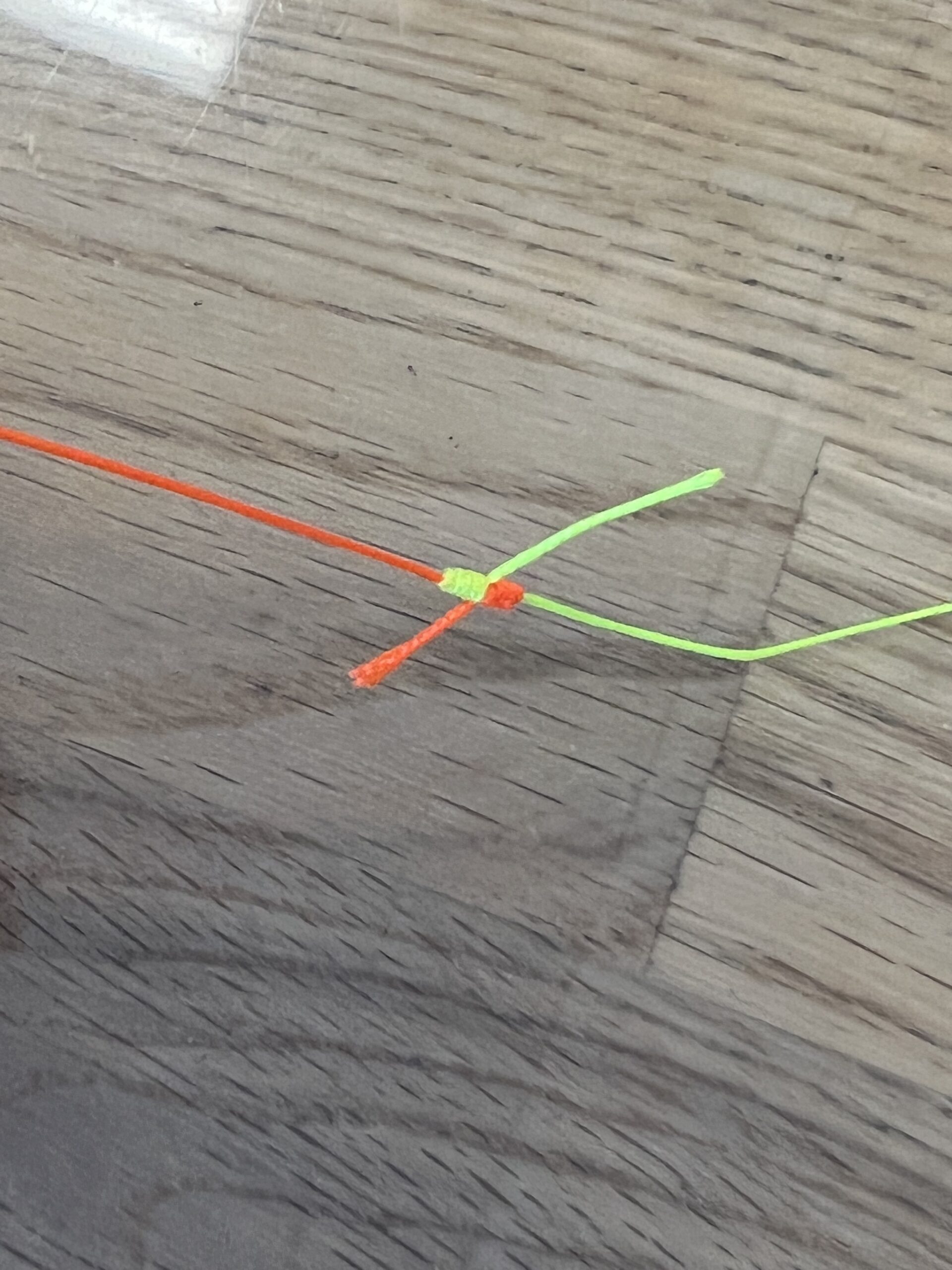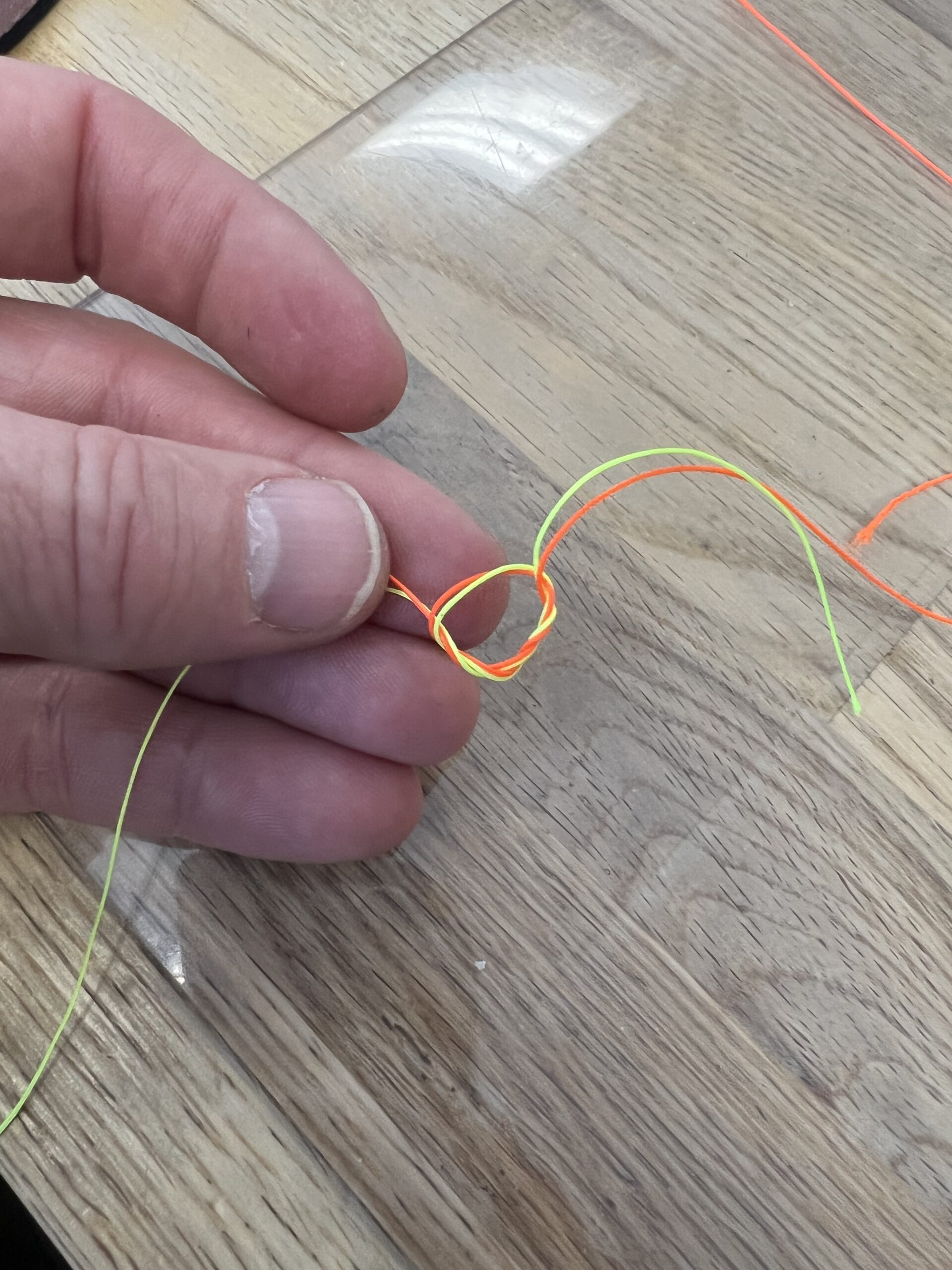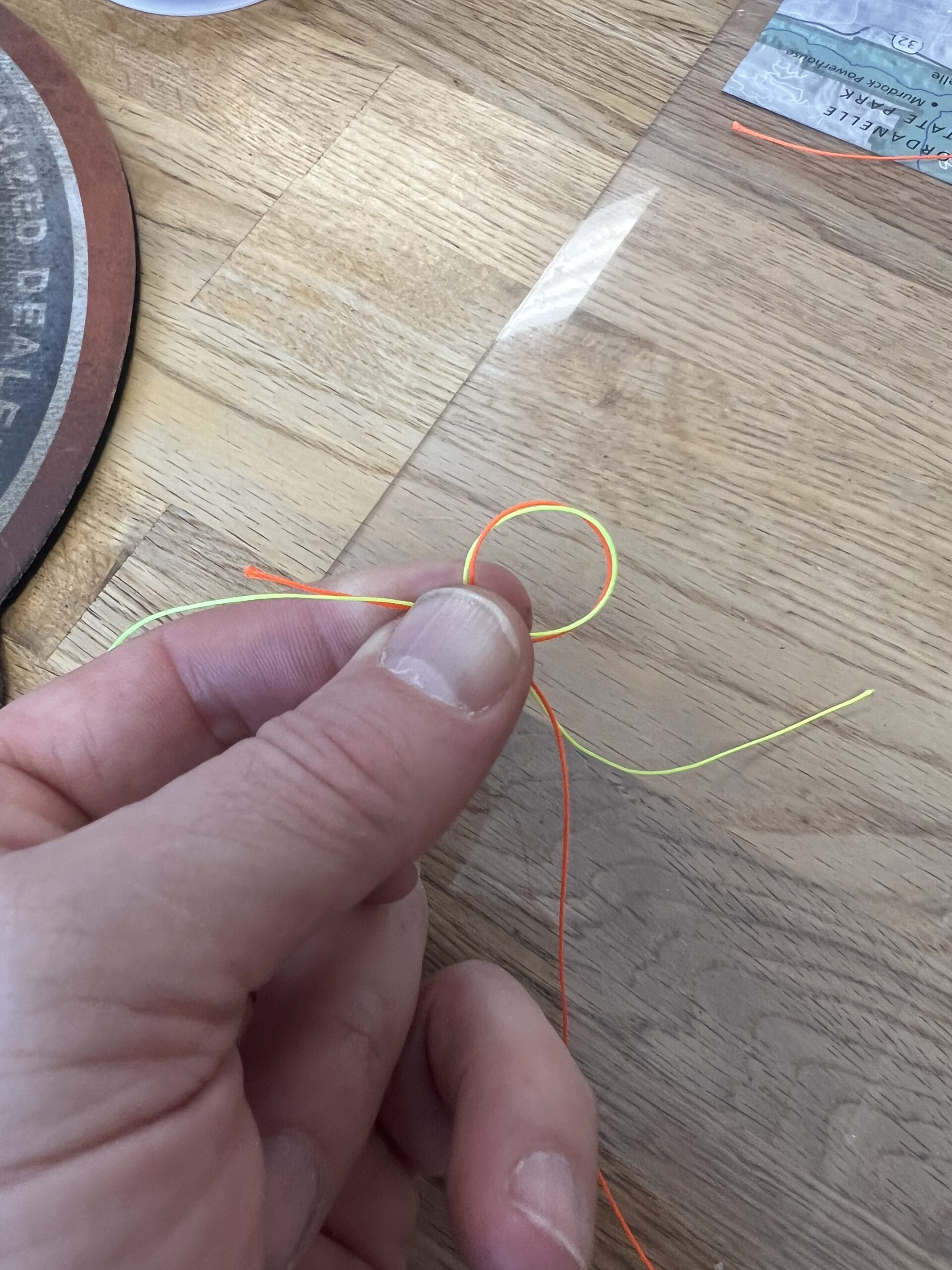 - Cross the leader (orange) and tippet (yellow), pinching where they intersect with your thumb and index finger.