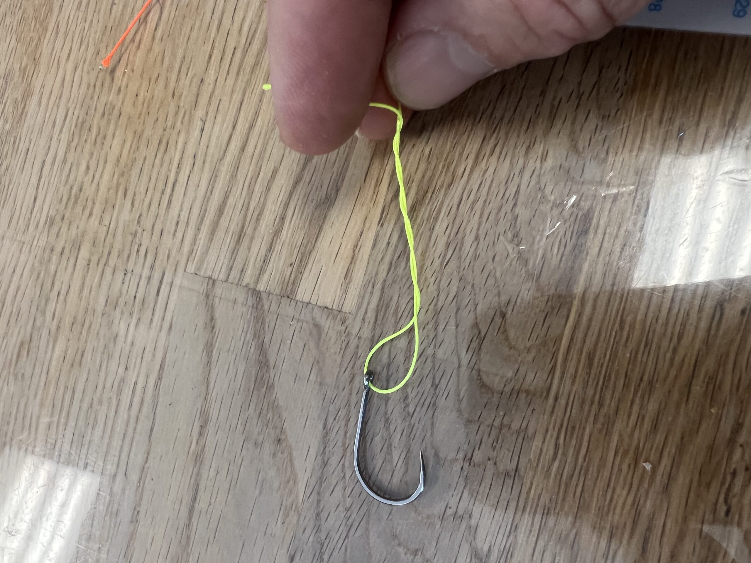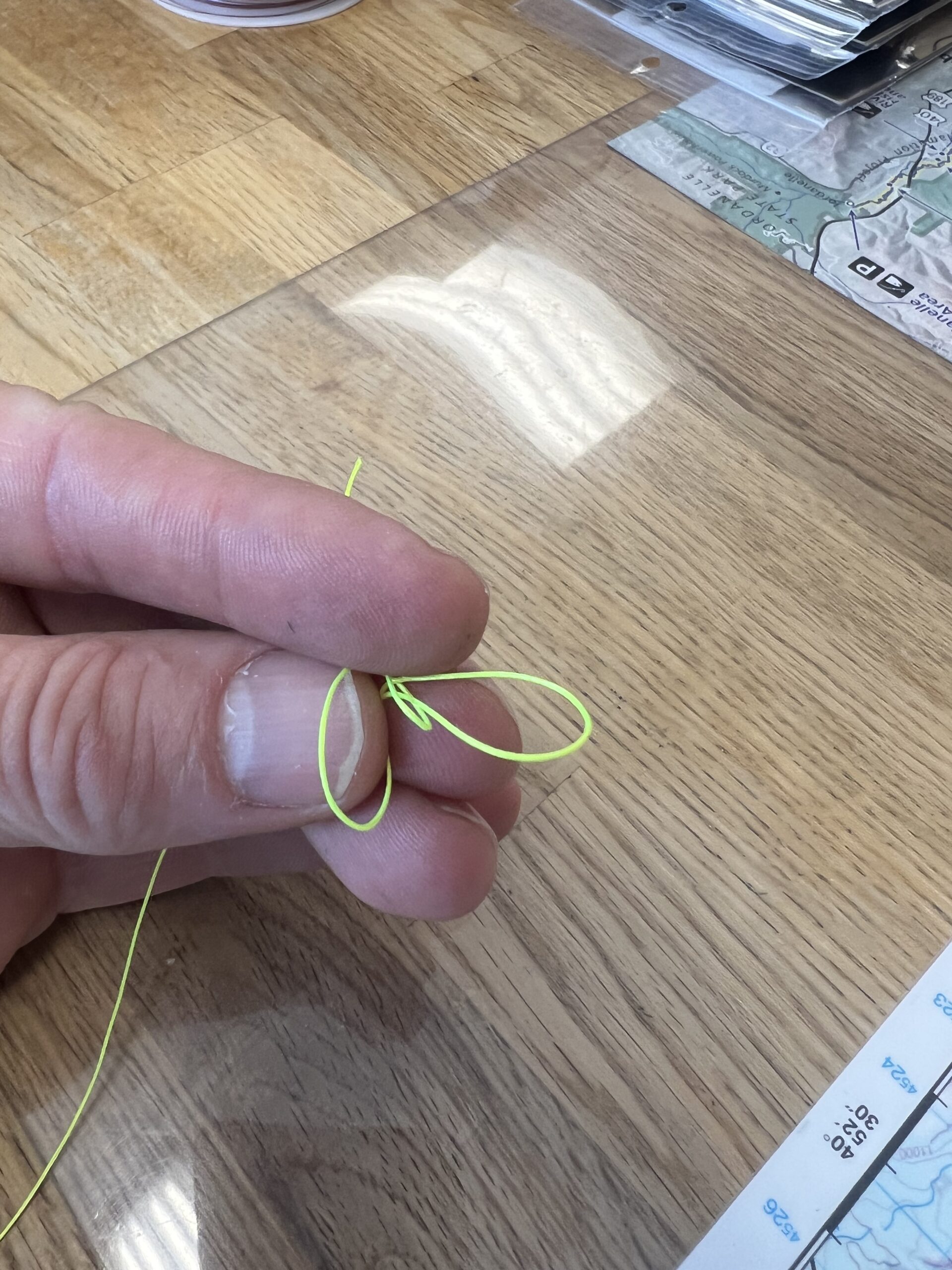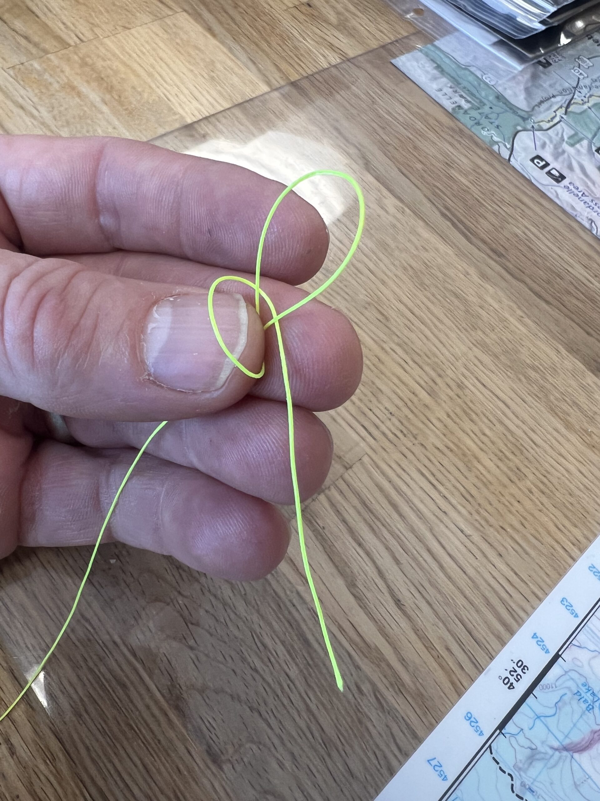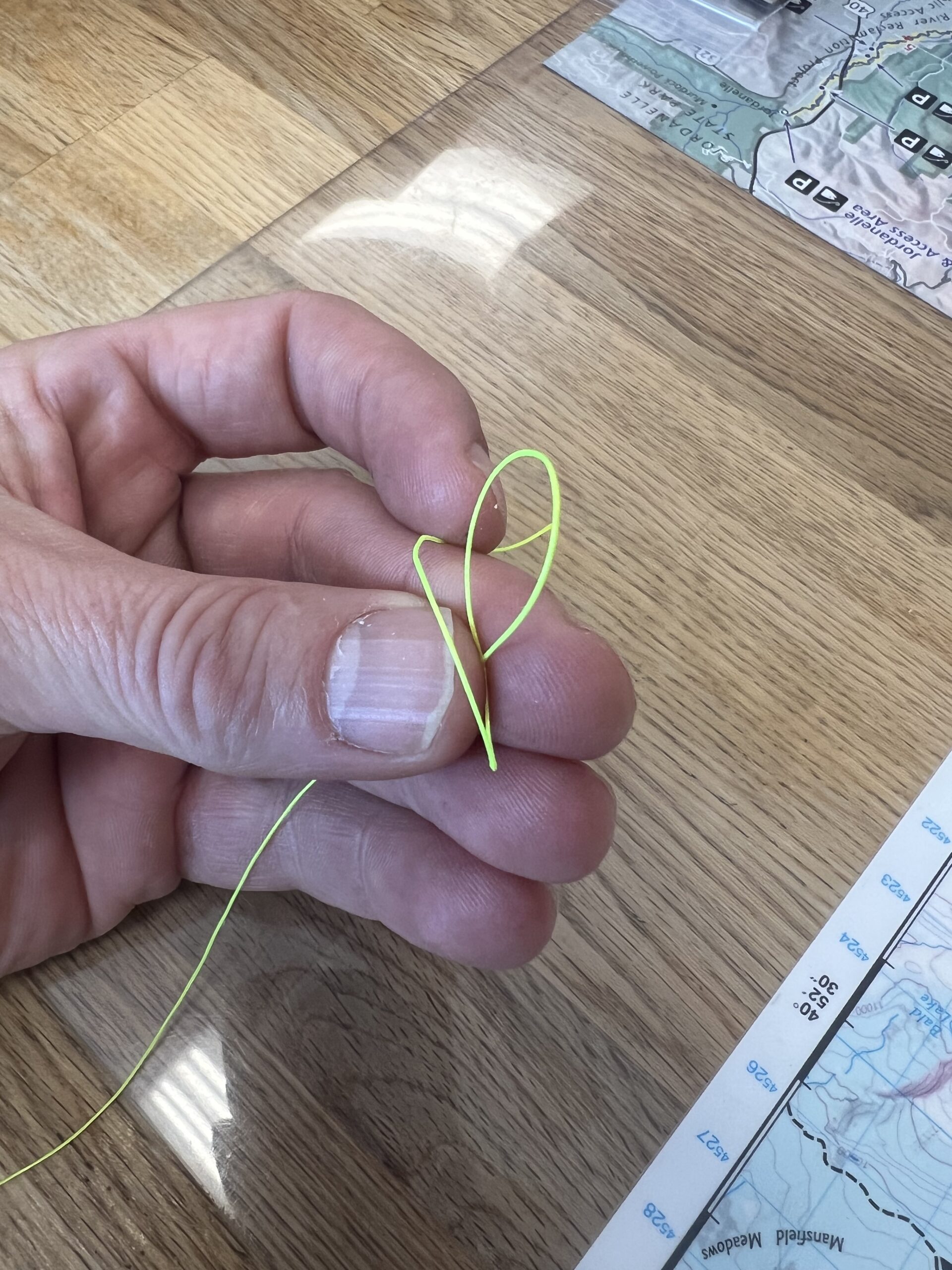 - Cross the leader (orange) and tippet (yellow), pinching where they intersect with your thumb and index finger.