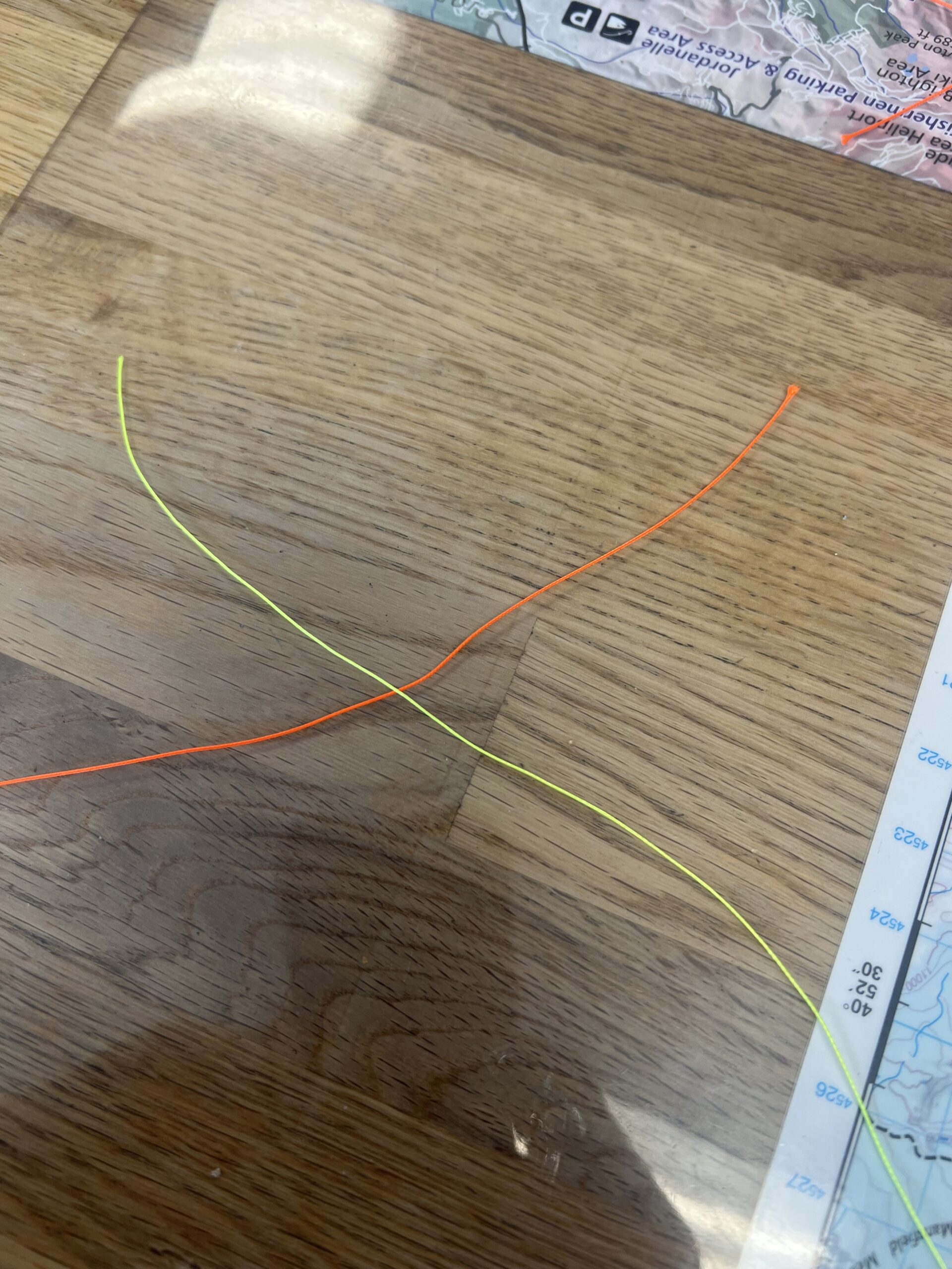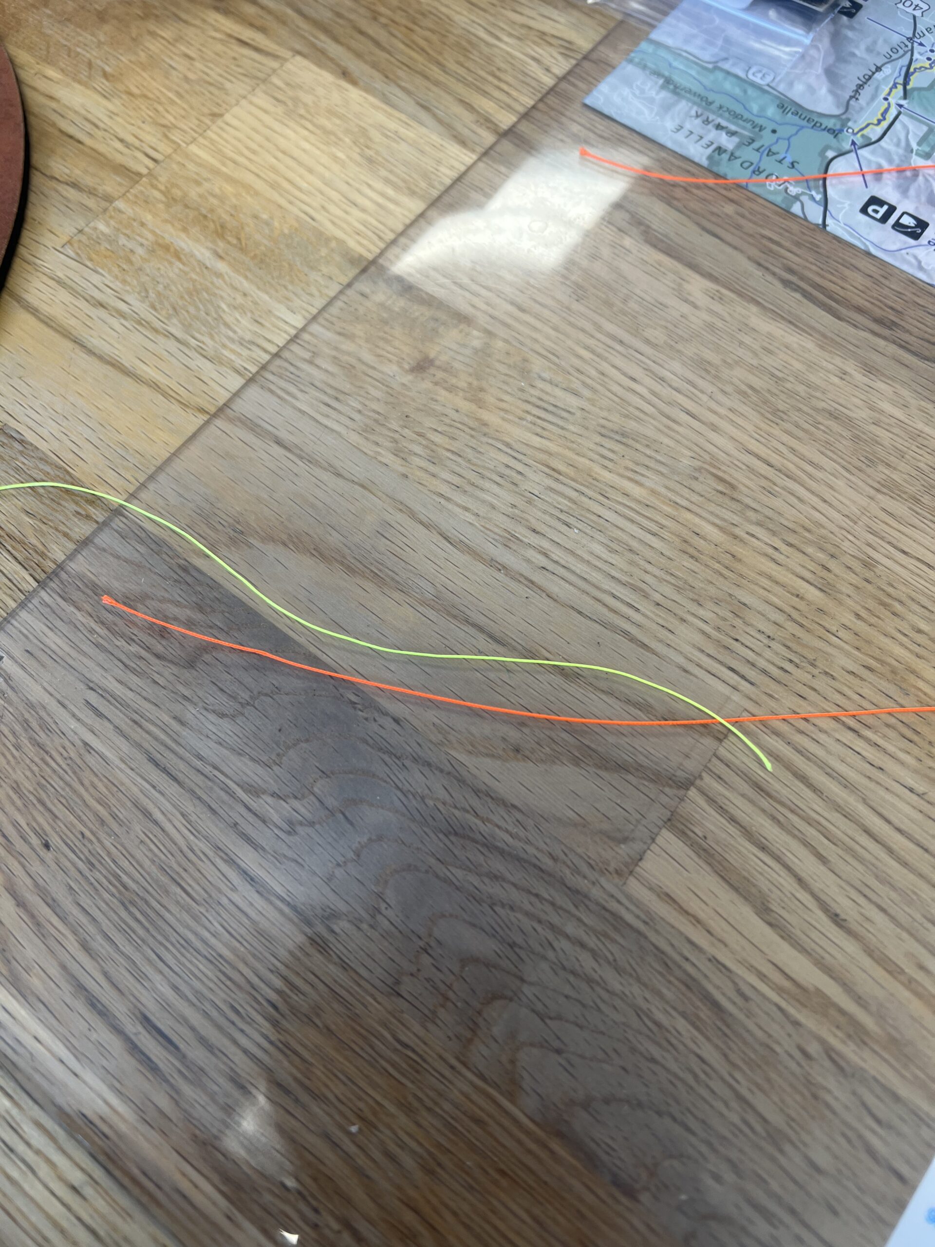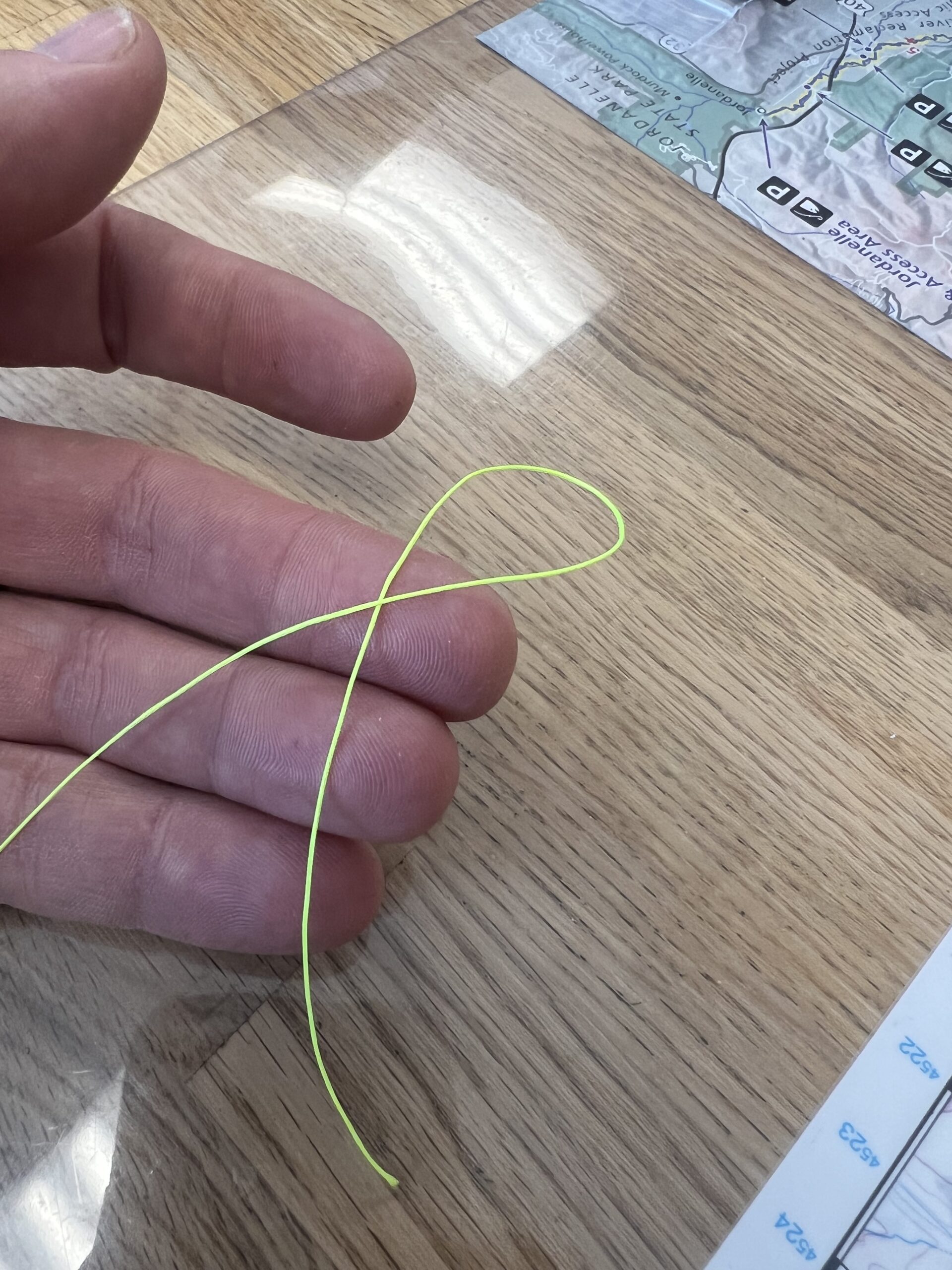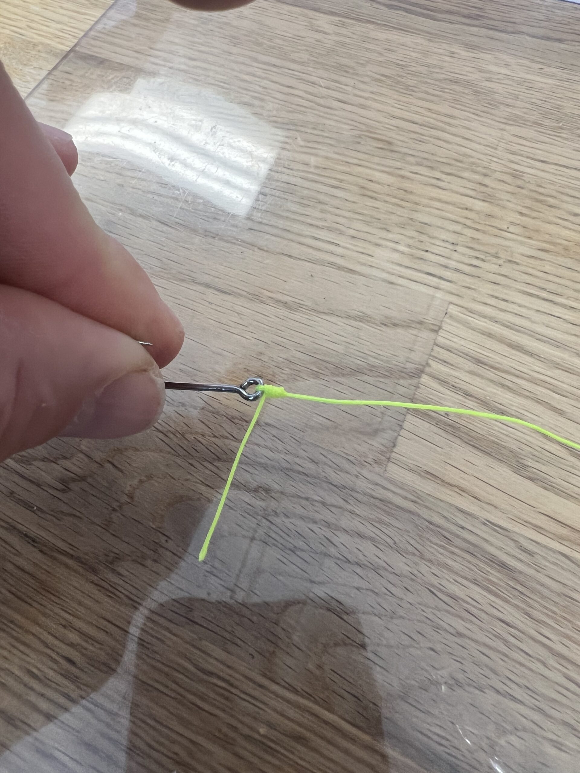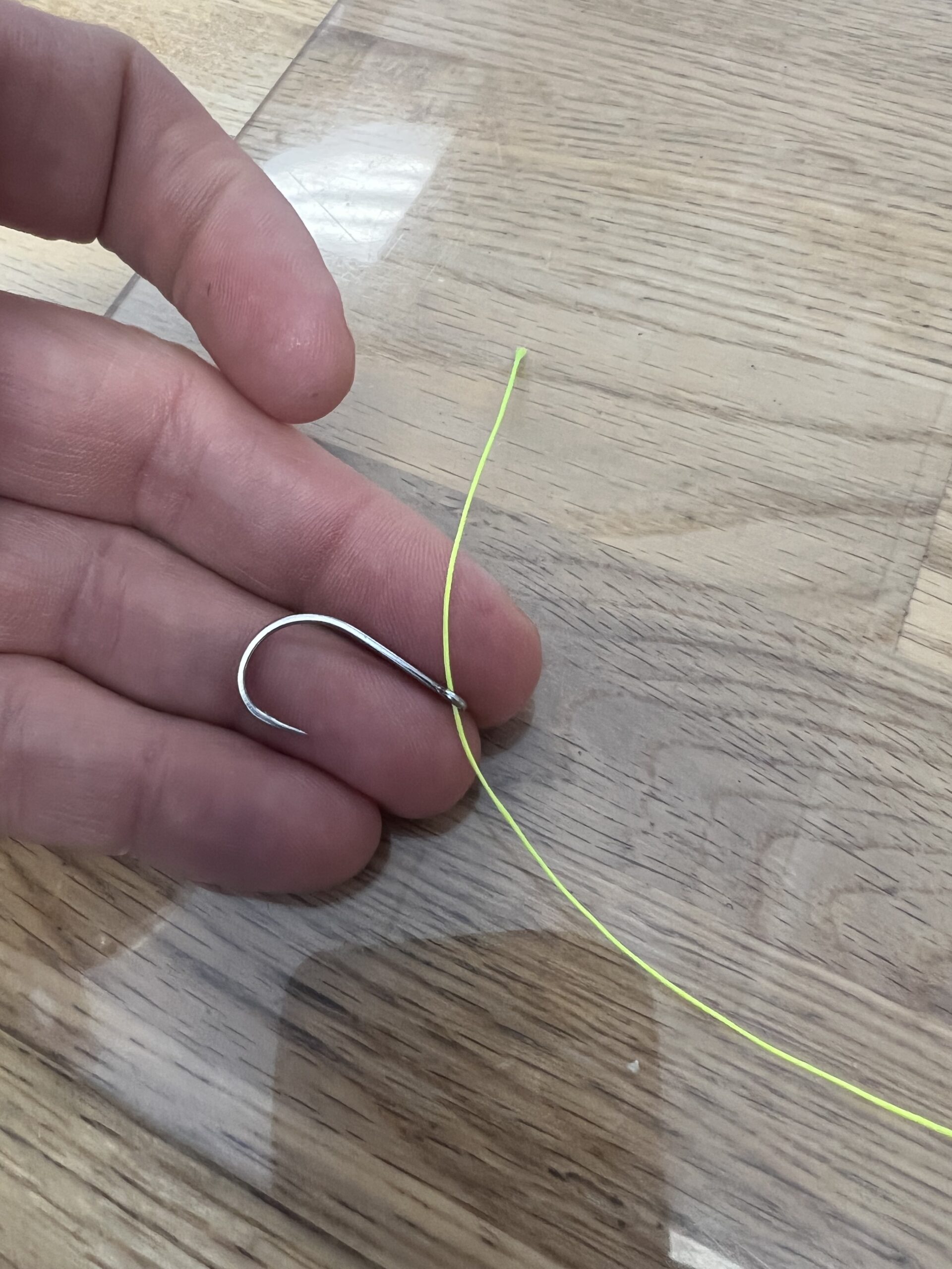 - Cross the leader (orange) and tippet (yellow), pinching where they intersect with your thumb and index finger.