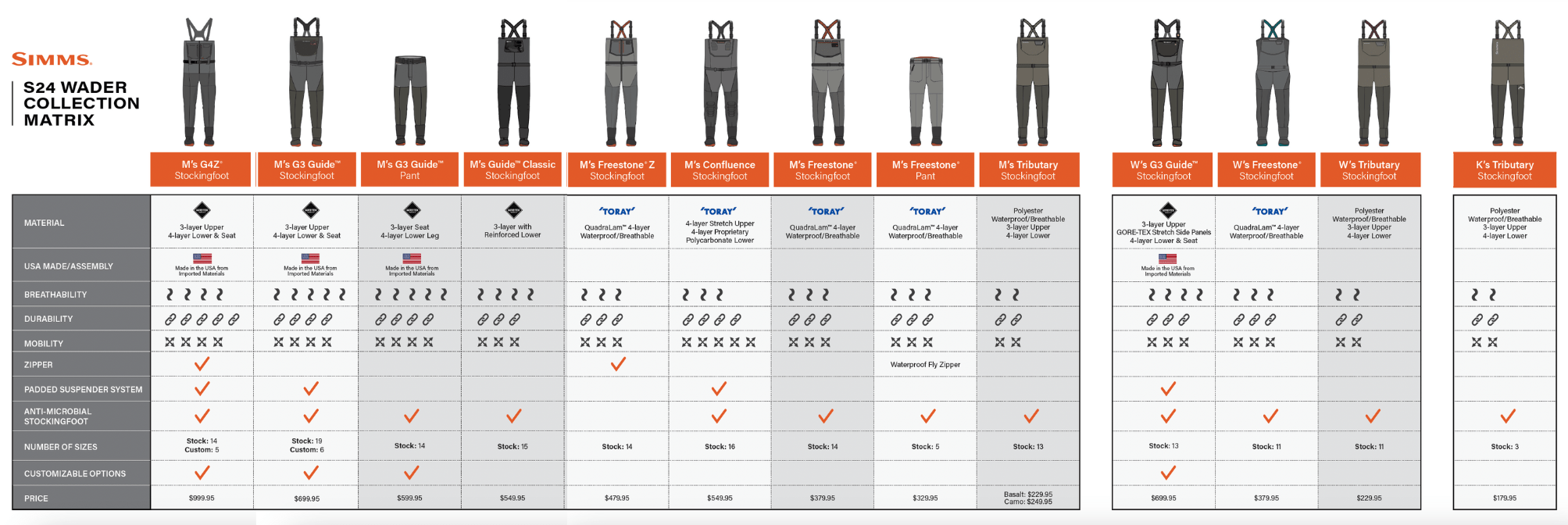 - The most size options offered by Simms, 19 stock sizes (ability to customize)